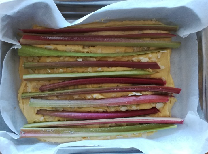 Verwarm de oven voor op 175˚C. Bekleed een bakvorm met bakpapier (ik koos voor een rechthoekige van 25×35, maar rond of kleiner kan ook – dan heb je gewoon een dikkere laag cake). Was en droog de rabarber en snijd in stukken die passen bij je vorm. Mix de boter met de suiker tot een romig geheel. Voeg één voor één de eieren en dan de amandelolie toe. Meng het bakmeel met het zout en de specerijen en voeg (gezeefd) in delen toe aan het beslag. Verdeel het beslag over de bakvorm, bestrooi met de amandelen en druk de rabarber in het beslag. Strooi de suiker over de rabarber en bak ca. 45 minuten in de oven.