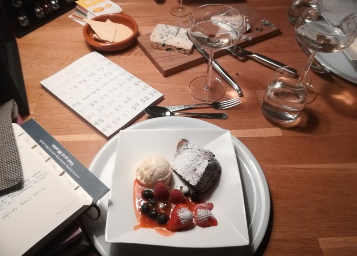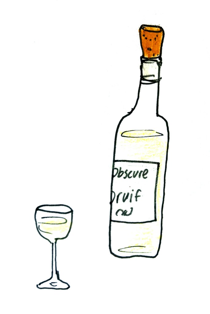 ‘Deze wijn zou goed bij de salade moeten passen,’ zei de Wijnzuster terwijl ze een klassiek Franse salade met spekjes en een gegrild geitenkaasje voor me neerzette. ‘Maar het is wel een beetje een obscure druif.’ De salade was heerlijk en de wijn ook: lichtgeel en geurend naar peer, linden en onrijpe meloen. Obscure druiven vind je vaak in Italië, dus na uitgebreide determinatie was dat mijn gok. Helaas. Het bleek een Pinot Auxerrois te zijn, die we nota bene zelf bij de boer gekocht hadden! In het najaar maakten we de Wijnzuster en ik een kleine wijnreis door Nederlands en Belgisch Limburg met Maurice Warnier, onze gastvrije gids. In zijn eigen auto reed hij ons rond langs verschillende wijnboeren, waaronder Johan Jacobs van Thilesna, die net bezig was zijn druiven binnen te halen. Vol enthousiasme liet hij ons de nieuwe kelder zien, de etiketteermachine die leerlingen van de plaatselijke technische school voor hem gebouwd hadden en hij liet ons proeven. Verrast door de smaak van de Pinot Auxerrois besloten we wat flessen mee te nemen. Lekker bij een gegrild geitenkaasje dus! De tweede wijn kwam van een druif die iets minder obscuur is, maar wel Italiaans: de laag alcoholische, licht mousserende moscato d’Asti. Dit is typisch een wijn voor bij een fruitdessert, maar ik had ergens gelezen dat een wijnboer er ‘verse gorgonzola’ bij at. Wat dat ook mocht zijn. Dus dat deden we maar, een dolce en piccante, waarvan de dolce heel mooi paste. Onverwacht lekker! Daarna was er een dessert van lichte chocoladetaart met amandel en kardemom (ja, van de zielige haas), vers citroenijs met lemoncurd en meringues, rood fruit en een coulis van aardbei en rabarber. Dat was verrukkelijk bij de geur van rijpe meloen, ananas, muskaat en oranjebloesem en de zoete smaak van de wijn. Echtgenoot J. die wat later aanschoof wilde ook nog wel een glaasje. Alles was al op. Dat krijg je ervan.