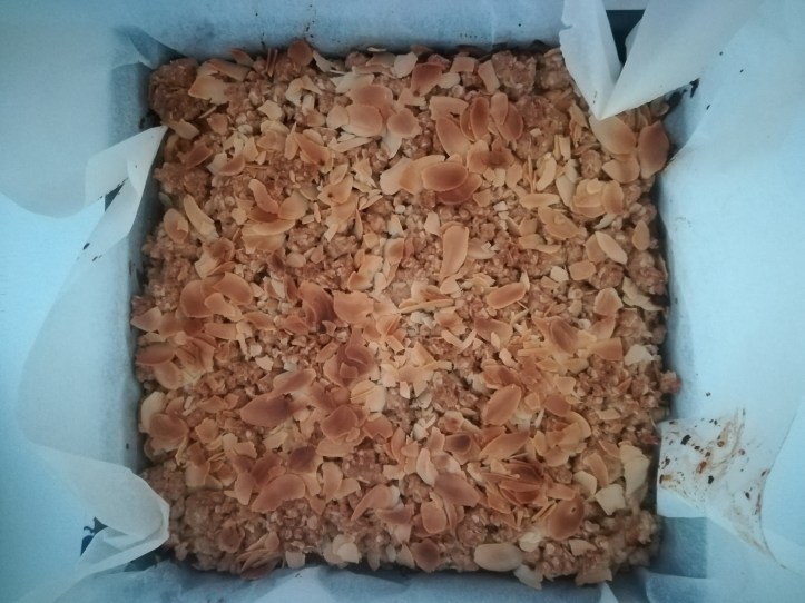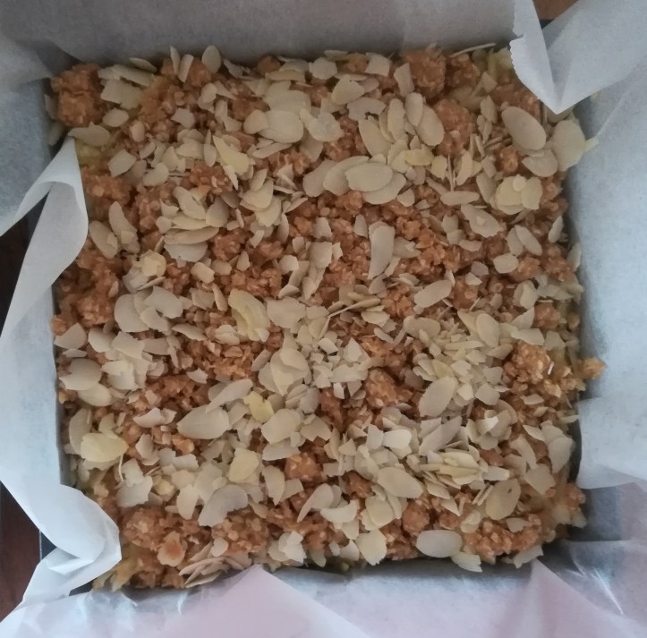 Verwarm de oven voor op 180 ºC en bekleed een bakvorm met bakpapier. Smelt de boter. Meng in een grote kom havervlokken, bloem, suiker, zout, bakpoeder en specerijen. Schep de gesmolten boter erdoorheen tot het een geheel is en druk ongeveer ¾ ervan in de vorm. Bestrooi met de rozijnen. Haal de klokhuizen uit de appels en rasp ze grof (ik laat de schil er gewoon aan zitten). Pak steeds een handje geraspte appel, knijp dit een beetje uit boven een schaaltje en verspreid de appels over de rozijnen. Verdeel de rest van het deeg over de appels (als een crumble) en bestrooi met de amandelen. Zet de bakvorm in de oven, drink het verse appelsap uit het schaaltje lekker op (wacht niet te lang, anders wordt het bruin!) en bak ongeveer een uur. Eet lekker!