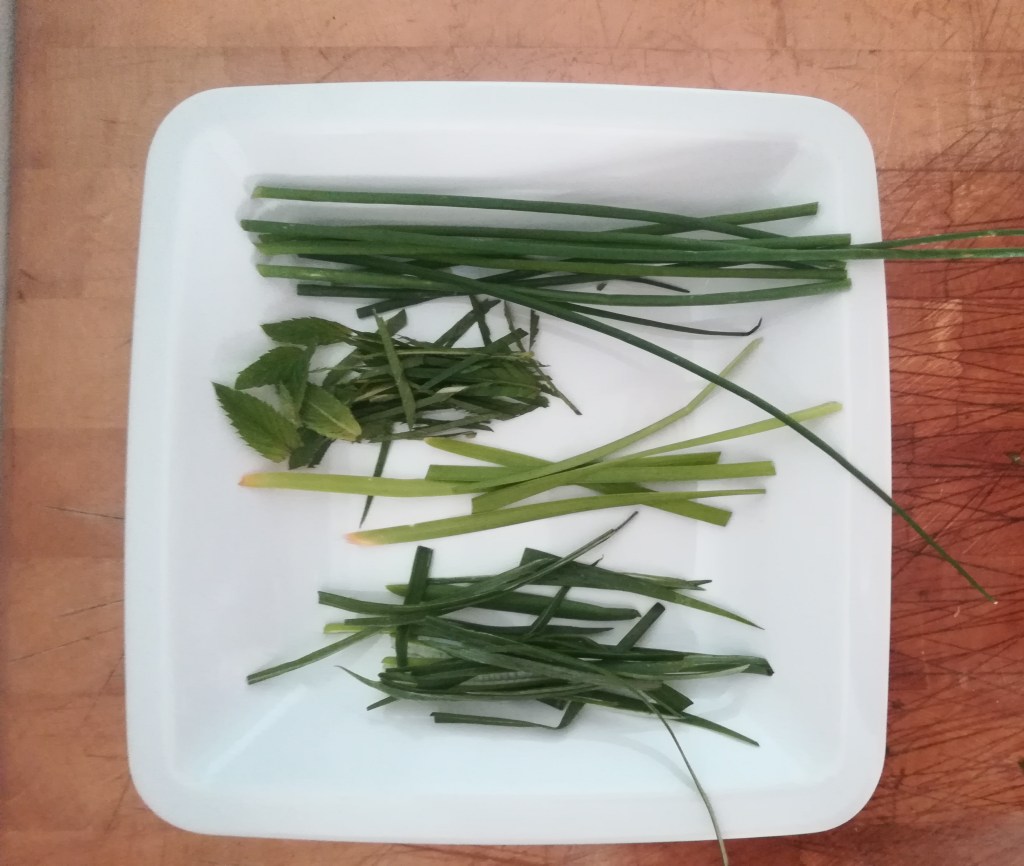 Deze salade is eenvoudig en expres licht gehouden, omdat er meerdere gangen waren. Wat geroosterde walnoten erbij zou lekker zijn geweest, misschien wat brood en kaas. Ik wilde eigenlijk met witte asperges werken, maar die kon ik niet meer vinden. Het werden groene die ik wilde grillen, maar die ik uit tijdnood toch maar rauw in de salade verwerkte. Dat was ook lekker, maar met grillen voeg je wel een lekkere smaak toe. Ooit maakte ik een vergelijkbare salade eens met pistacheolie en geroosterde pistachenoten. Allemaal lekker.