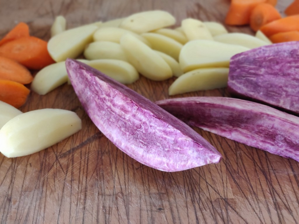 Deze week zat er een paarse kumara/bataat/zoete aardappel in de groentetas. Hij zag er prachtig uit! Ik roosterde hem met aardappel en wortel en ook dat zag er prachtig uit toen het uit de oven kwam. Maar hij was melig. Deze wel.