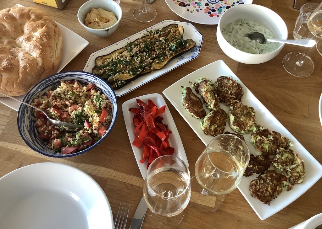 Dit jaar maakte de Reestlandhoeve ook een blanc de noir – een witte wijn van blauwe druiven. Er vindt geen schilweking plaats, dus de wijn blijft mooi licht. Deze Reestlander wit van Regent en Johanniter was een beetje champagnekleurig en lekker fruitig en zodra we thuis waren besloot ik er dan ook iets bij te koken. Omdat we dit jaar in Nederland bleven bedacht ik een vakantiekookproject, tot plezier van mijn huisgenoten. Italië hadden we al gehad (erwtengeluk) en nu was Turkije aan de beurt. Ik had gelezen dat rosé een goede keuze kan zijn bij mezzes en omdat deze blanc de noir me daar een beetje aan deed denken, maakte ik Turkse gerechtjes. Ik haalde er voor de aardigheid een Griekse wijn bij (het eten is natuurlijk vrij vergelijkbaar, al mag je dat vast niet zeggen), zette muziek van Karsu op, maakte me een uurtje of anderhalf kwaad in de keuken en we konden aan tafel: courgettekoekjes, geroosterde paprika, cacik, humus, geroosterde aubergines met walnoot, kisir (bulgursalade) en een (gekochte) pide. Als dessert maakte ik een compote van verse abrikozen met amandel en pistache, die ik serveerde met een schep Turkse yoghurt. Het was heerlijk! De Reestlander paste het beste, behalve bij de scherpe smaak van rauwe knoflook in de cacik. Dat verraste me, want de geur van aardbeien en bosbessen leek me aanvankelijk wat zoet, maar ik ontdekte ook wat saffraan en de smaak was fruitig maar mooi droog met een fris-zure afdronk. De Assyrtiko (Griekse witte druif) was nog hoger in de zuren en vrij mineralig, met veel citrus en wat walnoot in de neus. Ik vond het niet een heel mooie combinatie met de mezzes – te zuur – maar hij paste wel beter bij de cacik dan de Reestlander.