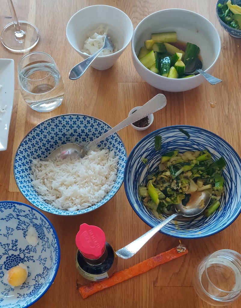 Het vakantiekookproject bracht ons onverwacht naar China: de groentenla bood paksoi, lente-ui, verse gember, een restje courgette, een komkommer en de nieuwe groentetas een spitskool.