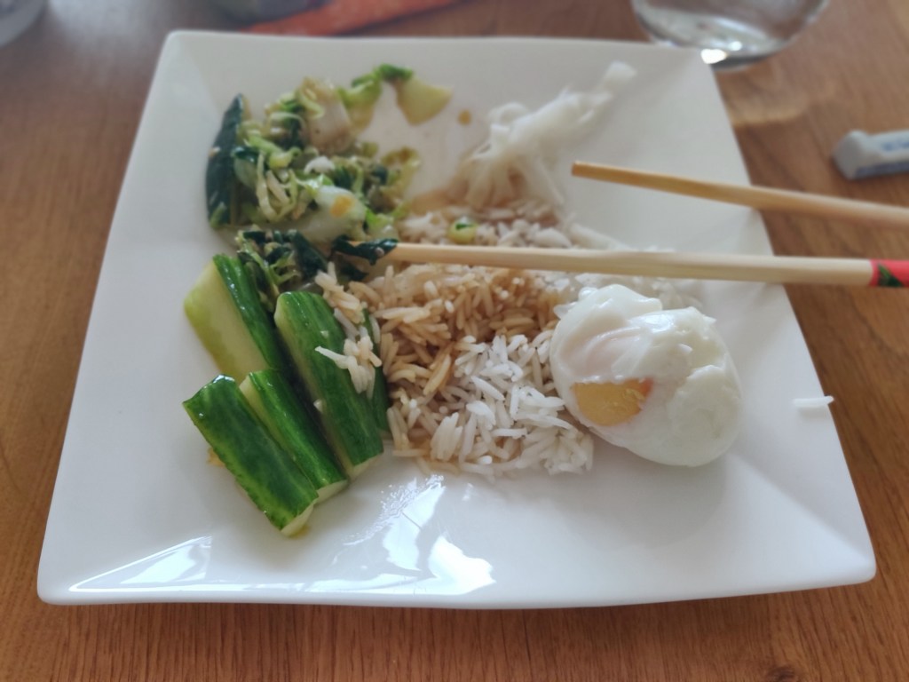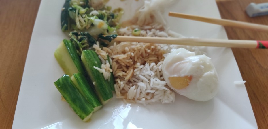 Ik maakte er rijst, mie en eieren bij, en een aromatische komkommersalade zoals we in een achterafstraatje in Bejing aten. Deze techniek is gebaseerd op een lesje Atjar maken op Bali, maar het werkt en het resultaat komt echt in de buurt van de komkommer zoals in China. De sichuan peper die erin zit is vooral aromatisch en tintelend, niet echt pittig. Het ruikt aangenaam, een beetje naar citrus. Voor dit gerecht moet je even precies en snel werken, maar als je eenmaal aan tafel zit kun je rustig genieten van een groen maaltje.