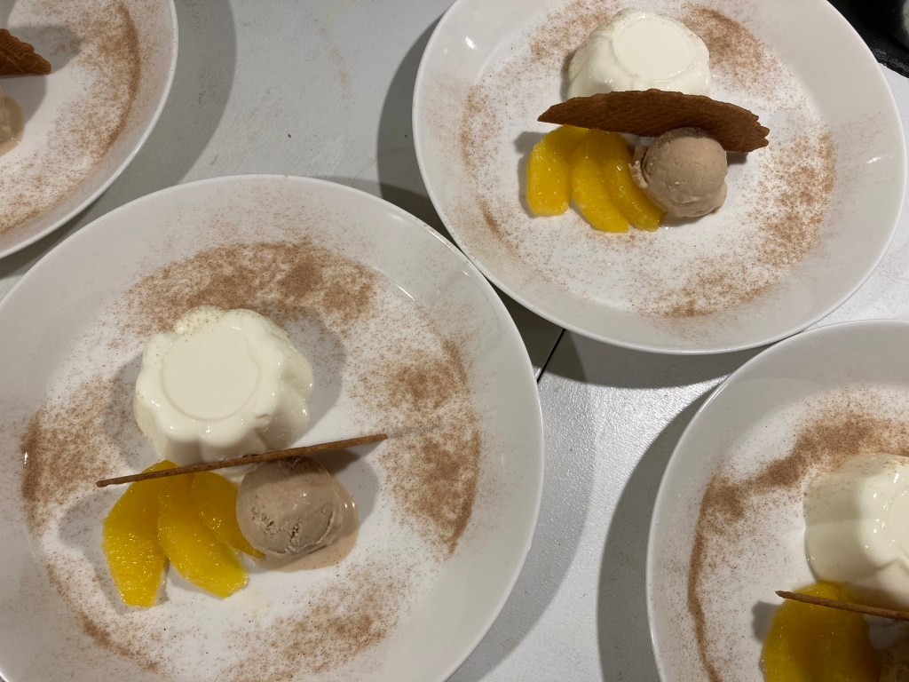 Als je zover bent, stort je de panna cotta op een bord en leg je er gezellig wat sinaasappel bij. Je kunt de marinade over de puddinkjes gieten en/of, zoals ik deed, wat ijs of een koekje toevoegen. Eet lekker!