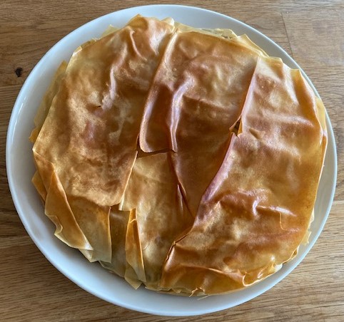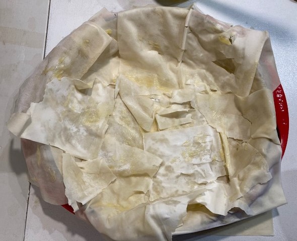Als je filodeeg gebruikt, werkt het iets anders. Leg één voor één ongeveer de helft van de filodeeglappen in de vorm. Dat worden meerdere overlappende lagen, waarbij je ieder vel steeds met een dun laagje boter of ghee besmeert. De lappen filodeeg moeten ook overhangen en het mag er rommelig uitzien. Doe dan de vulling erin en vouw het overhangende deeg over de vulling. Leg er dan de resterende bladen in meerdere lagen op, ook steeds weer met ghee ertussen en stop de randjes in. Als je deeg op is bestrijk je de pastei met olijfolie (of ghee) en bestrooi je hem eventueel met wat sesamzaad.