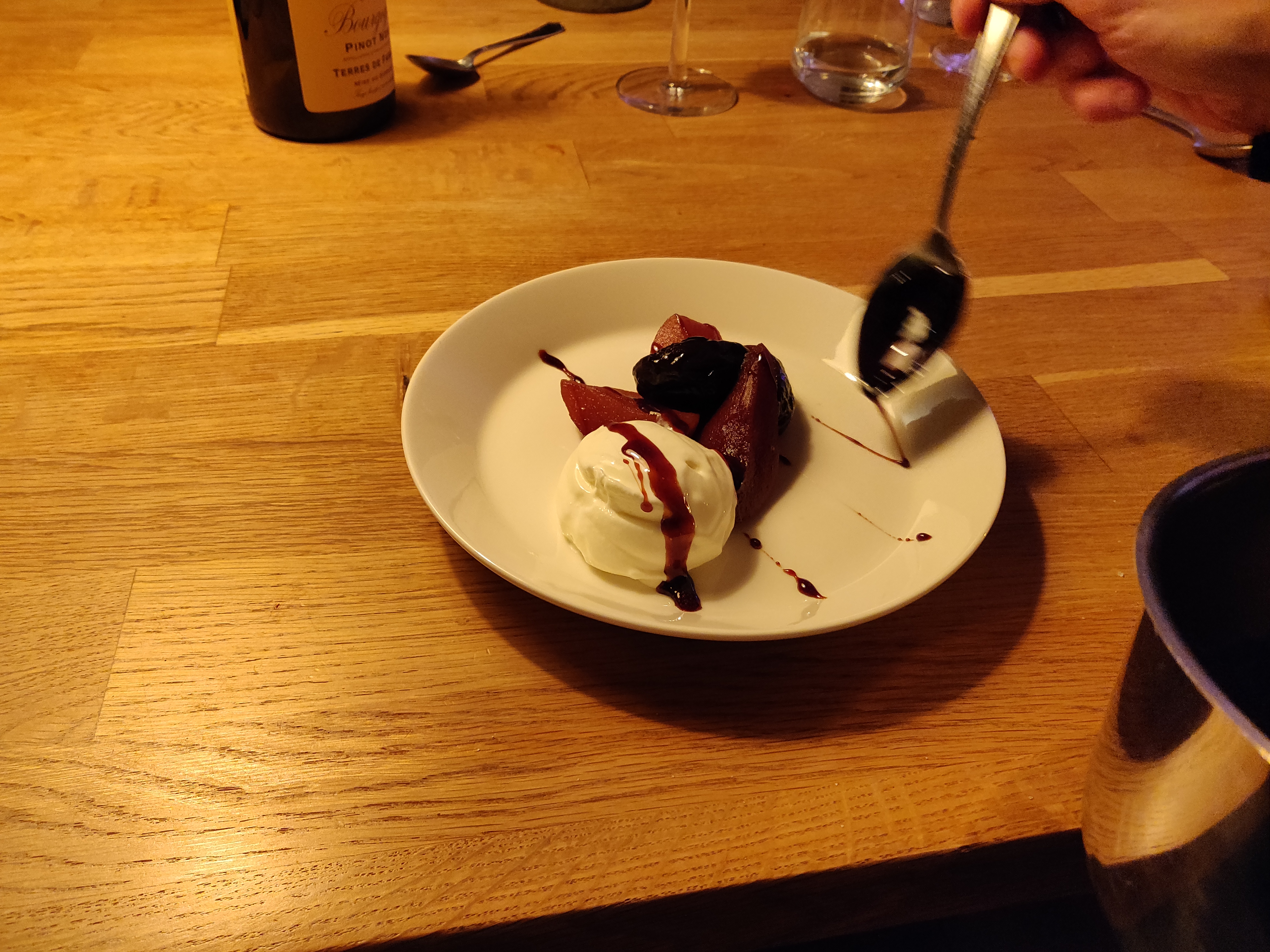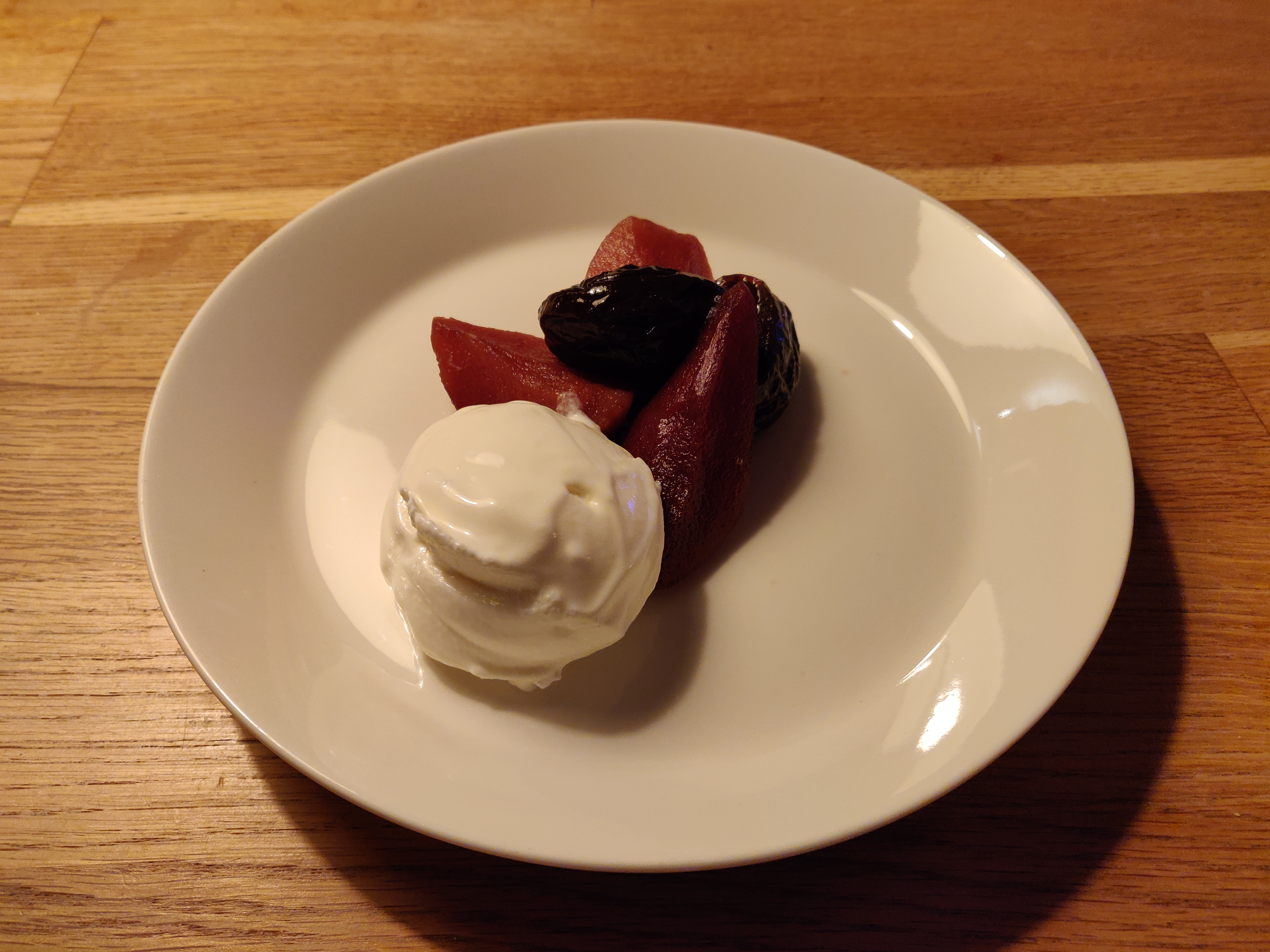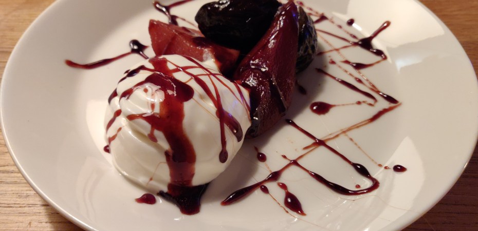 Het koken van het fruit was al een feest. Die geur die in huis hing! Die specerijen die zo mooi opzwollen! Die diepe kleuren! Het fruit serveerde ik eerst als onderdeel van een diner bij een blauwe kaas en een paar dagen later bij een bol vers gedraaid yoghurtijs. Het kookvocht kookte ik bij dat laatste gerecht wat in – helaas iets te ver omdat echtgenoot J. me verleidde tot een dansje door de kamer, nooit doen tijdens het koken! – maar het kon nog. De ochtend erna gingen de restjes op bij de wentelteefjes met kaneel en vanille. No waste, en alles paste zo mooi en het was allemaal zo heerlijk. Werkelijk feestelijk fruit!