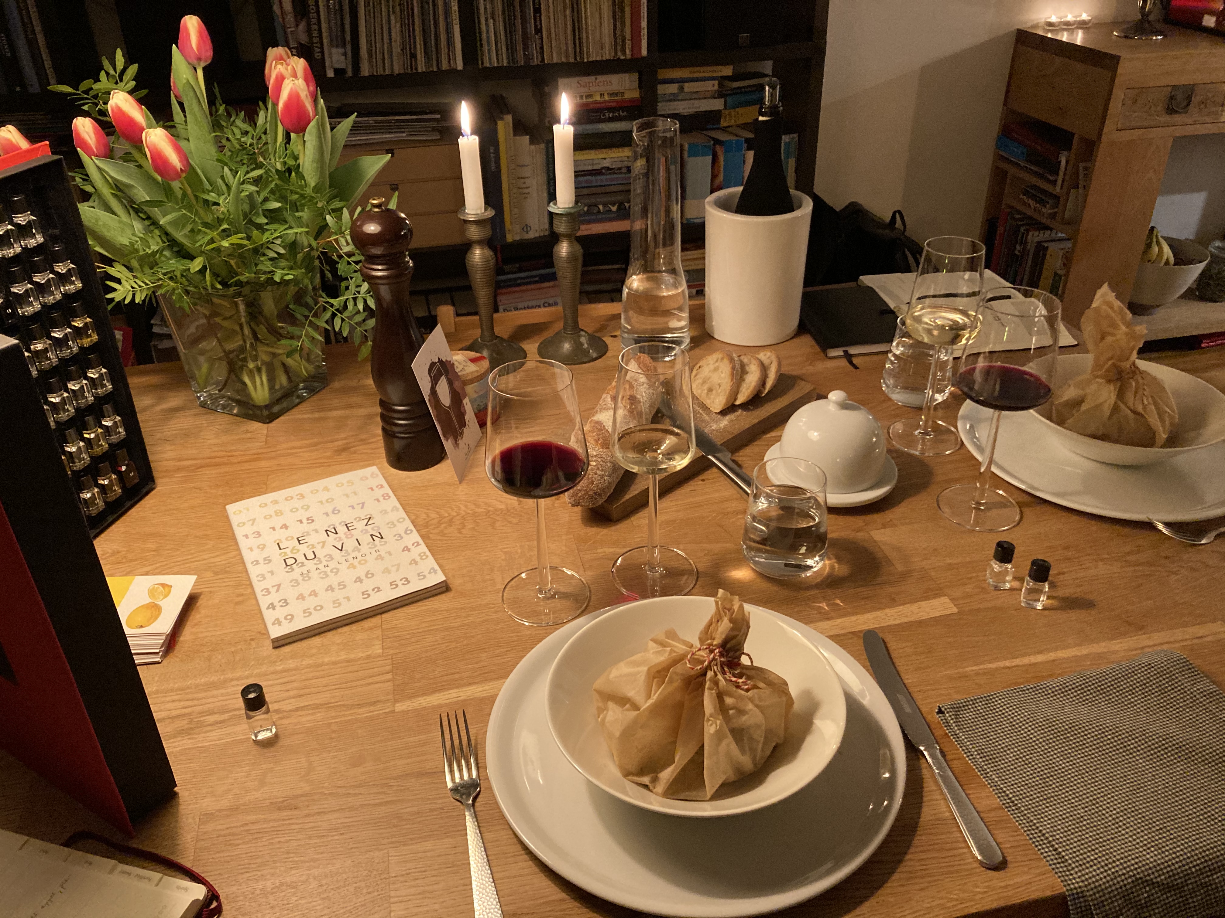 ‘Het is een beetje een snoepje, maar dan voor de hartig-liefhebber,’ roept de Wijnzuster. Wet februari is begonnen hoor! Het snoepje voor hartig-liefhebbers waar ze het over heeft is een dampende papillote met paddenstoelen, dragon en room. De Wijnzuster had ‘verrassing’ als thema bedacht en ik vind papillotes, hoe ouderwets ook, altijd een cadeautje op je bord. We drinken er een Rully bij, zo’n volle witte Bourgogne met boter en noten uit de Côte Chalonnaise. Deze is mooi in balans met het zuur van wat citrus en de fruitigheid van gele appel en peer. Omdat paddenstoelen ook mooi gaan met fruitige rode wijn, serveerde ik er daarnaast een glas Tinta de Toro bij, een Tempranillo uit Toro. Zonder houtrijping – een Joven. Vers rood fruit en peper, fruitig en lekker, maar niet zo lekker bij deze paddenstoelen. De Rully daarentegen past wonderschoon. We schrapen de restjes saus met lekker brood uit de papillotes tot er werkelijk niks meer in zit en verzuchten hoe fijn het is, dat deze maand weer gewoon nat is.