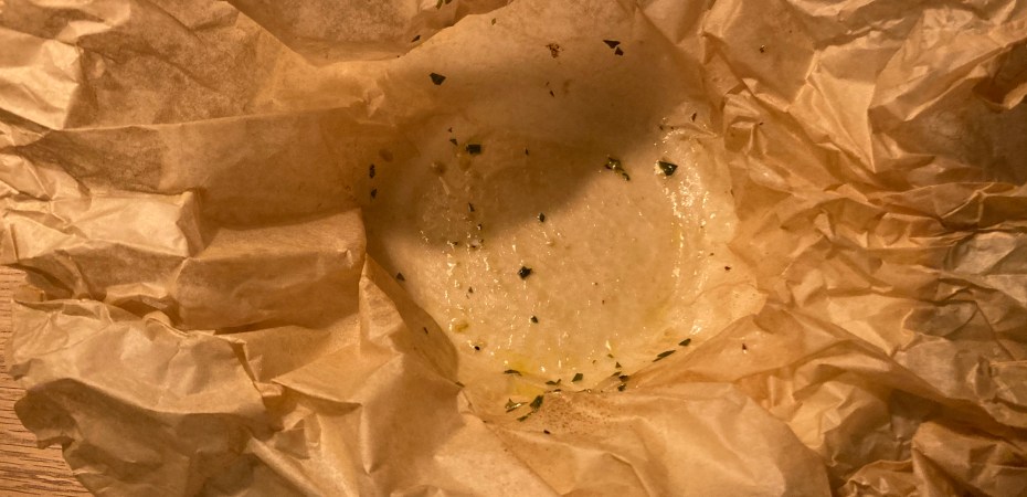 Deze papillote is gebaseerd op een recept van Ottolenghi en is gemakkelijk en snel te maken, zoals alle papillotes. Het komt hierop neer: je vouwt wat je lekker vindt in een stuk bakpapier, je doet even 20 minuten iets voor jezelf en je kunt aan tafel. Door eten in een afgesloten pakketje in de oven te garen, behoud je smaak en geur. Als je wat gemakkelijk smeltende kaas bij dit pakketje doet, zoals taleggio, en er goed brood bij serveert, heb je een maaltijd. Deze hoeveelheid is genoeg voor een tussengerecht voor drie of een maaltijd voor twee. Lege snoeppapiertjes verzekerd!