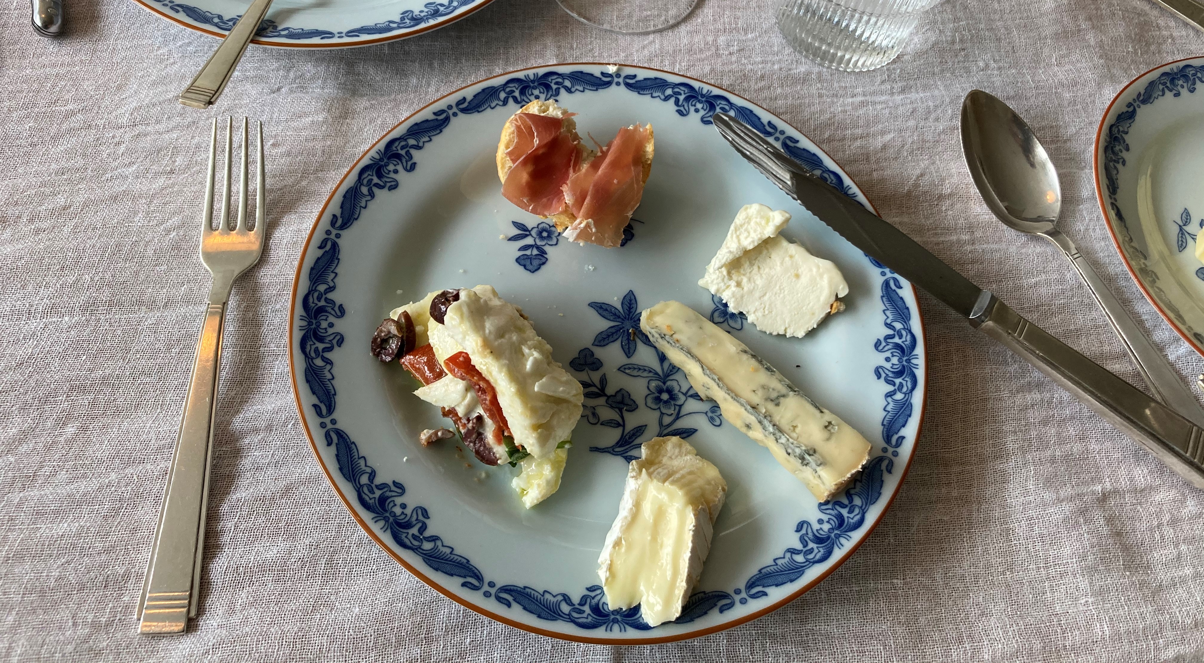 Zoals afgelopen Pasen. Terwijl kleine L. zich verheugde op de paaseieren in de tuin, verheugde ik me op een volle, gedekte tafel en een lekker glas. De Wijnzuster en ik deden niet aan een thema. We besloten gewoon te maken waar we zin in hadden, dus het werd een eclectisch geheel. Scones met rozemarijn, oeuf en cocotte met zalm, komkommersoep met garnalen, een goede plank kazen, verse foccacia, charcuterie, een citroen-meringue taart en een chocoladetaart met zoute karamel. Kleine L. bakte paaskoekjes met die kleine van de Overkant van het restje amandeldeeg, echtgenoot J. bakte op het laatste moment nog een joekel van een vlechtbrood, mrs. Elegance had prachtige eitjes opgestuurd uit Engeland. En dan was er nog die terrine natuurlijk. Er waren meer dan genoeg eieren om te zoeken en de tafel was helemaal vol en mooi. Iedereen blij.