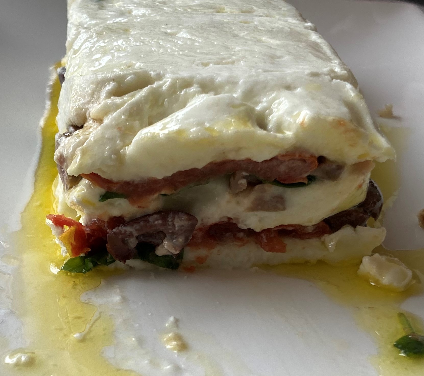 Ik weet niet meer zo goed hoe we erop kwamen, want het enige groene in het hele gerecht is een blad basilicum, maar ik weet nog wel heel goed dat ik het tijdens de voorbereidingen ergens las en dacht: dat lijkt me lekker! En dat was ook zo. Bij gebrek aan beter doopte ik het gerecht Terrine Caprese, omdat de ingrediënten veelal overeenkomen met de salade. Ik heb aan het recept sindsdien van alles aangepast en het nog vaak gemaakt.