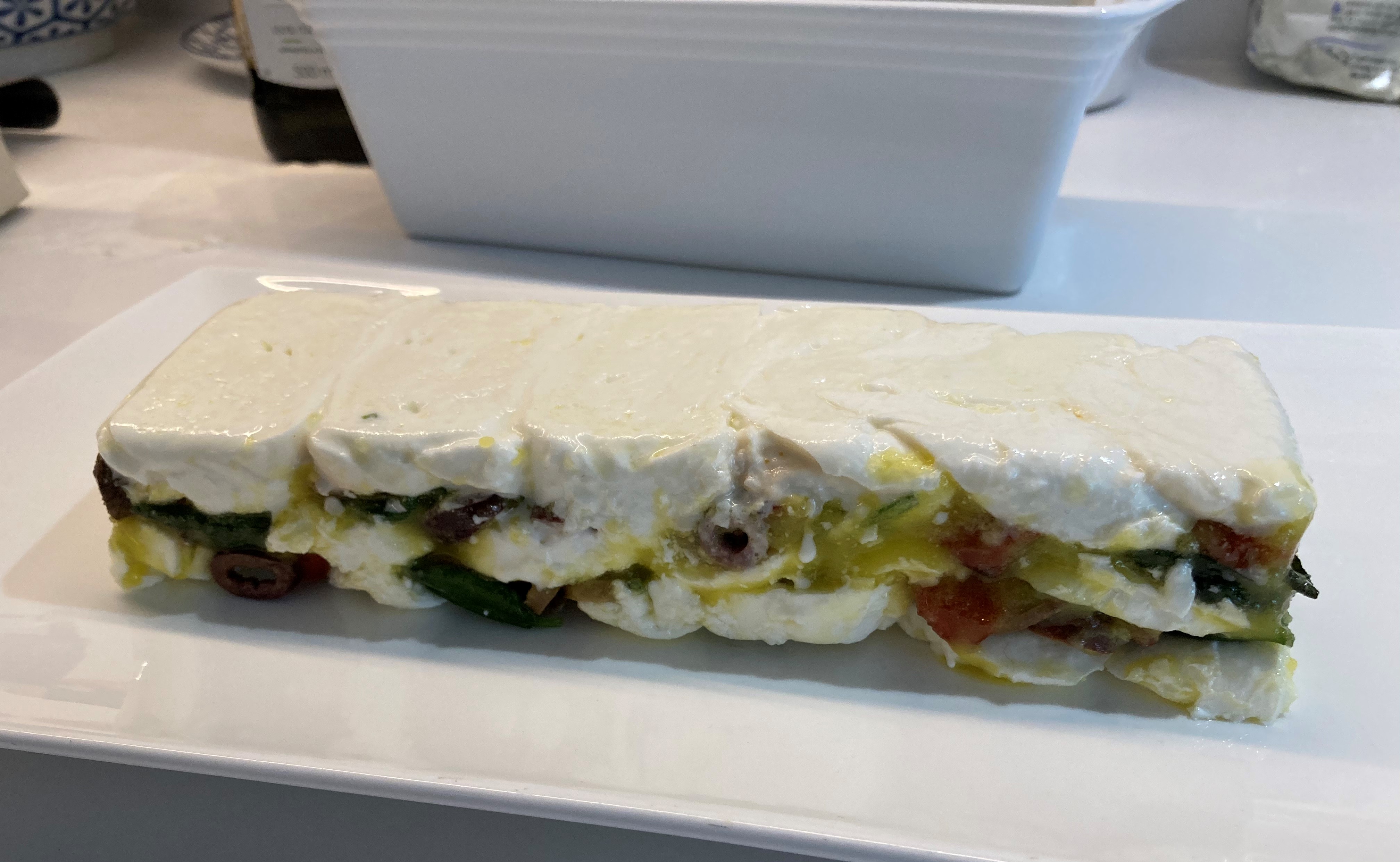 Vet je vorm licht in met olijfolie (en bekleed eventueel met huishoudfolie, zeker als het een metalen vorm is). Maak nu laagjes: mozzarella – tomaat, olijf, basilicum, knoflook en zout naar smaak. En dan weer mozzarella et cetera. Druk de laagjes telkens een beetje aan. Ik heb een vrij smalle vorm en kan zo drie lagen mozzarella maken (een laag per bol) en twee lagen vulling. Begin en eindig met mozzarella.