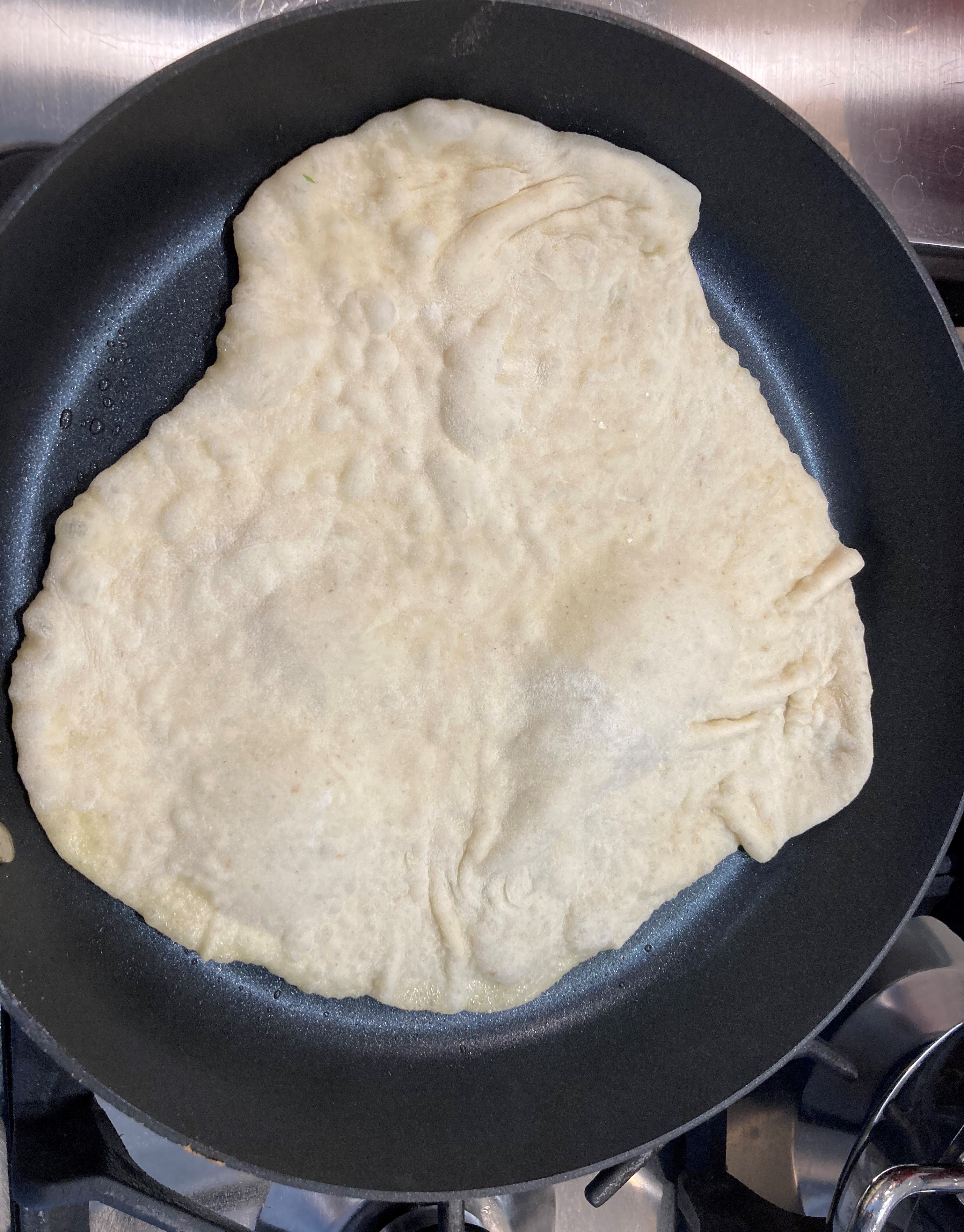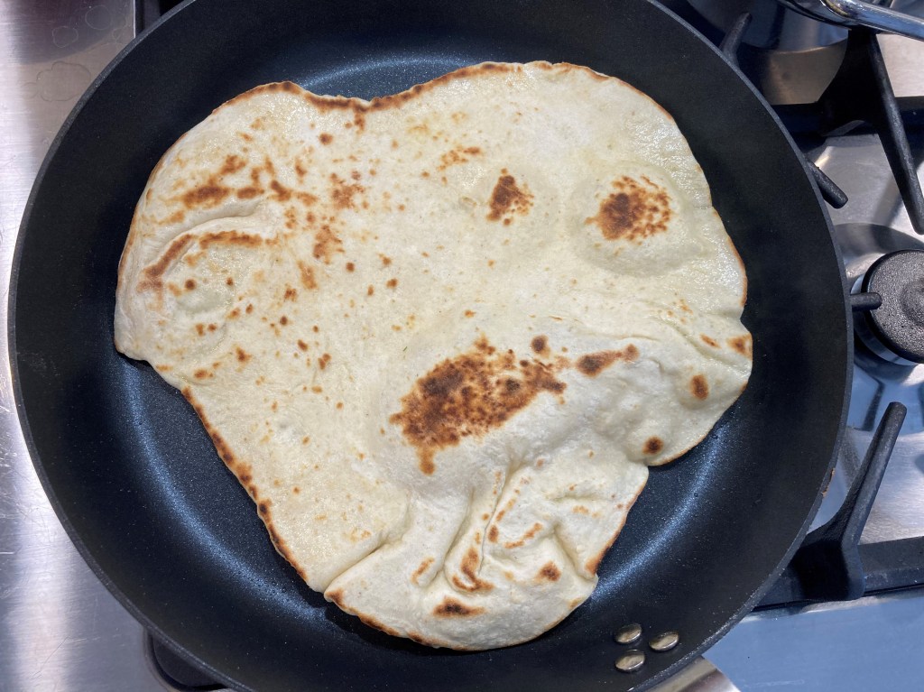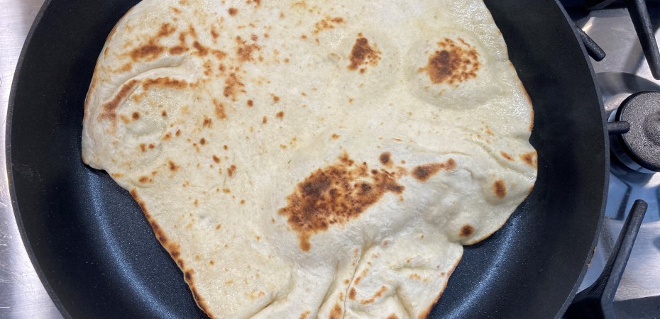 Leg een schone theedoek klaar en zet een grote koekenpan op hoog vuur. Verdeel het deeg in zes stukken en rol ze uit tot platte cirkels (of iets wat daarop lijkt). Giet een klein scheutje olijfolie in de pan, wals zodat de olie zich verdeelt en leg er dan een deeglap in. Houd het brood goed in de gaten, want het gaat snel, het bakken duurt maar een paar minuten! Keer om als de bovenkant droog wordt en blazen krijgt en laat de andere kant bruin worden.