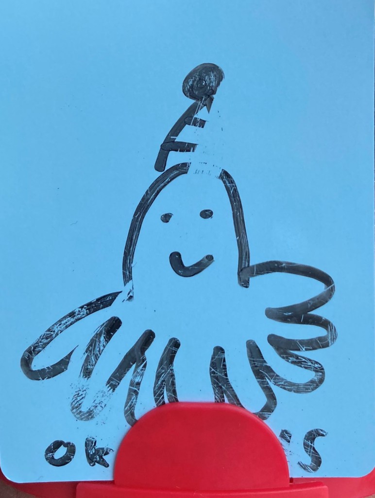Dus thuis dook ik met een kop koffie opnieuw de boeken in, liet me inspireren door Claudia Roden, raakte in de war van Giorgio Locatelli (die beweerde dat hij zijn polpo zijn hele leven op de verkeerde manier gemaakt had – de manier die ik net wilde uitproberen) en voegde toch maar een vleugje Spanje toe. Het werd me toch lekker! Kleine L. vond al die verse vis ook magisch en tekende een week lang een heleboel vissen en een jarige oktoopus.