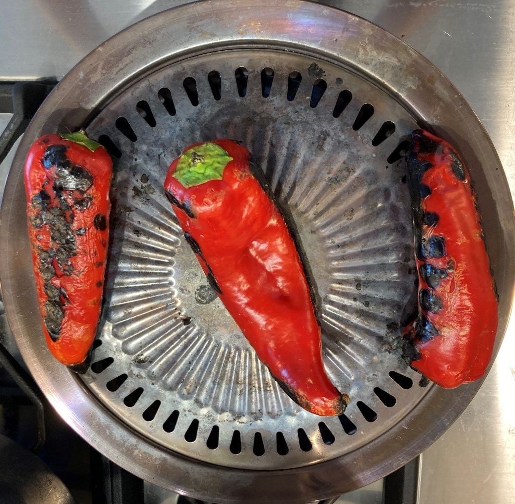Rooster eerst de paprika’s. Als je niet zo’n mooi roostertje hebt, rooster je ze in de oven (onder de grill of op een hoge stand) of op de barbecue tot ze zacht en liefst geblakerd zijn. Leg de gegrilde paprika’s in een pan met een deksel erop en ontvel ze na ongeveer 10 minuten. Ik doe dat in de buurt van de kraan, zodat je het geblakerde vel en de pitten er meteen af kan spoelen.