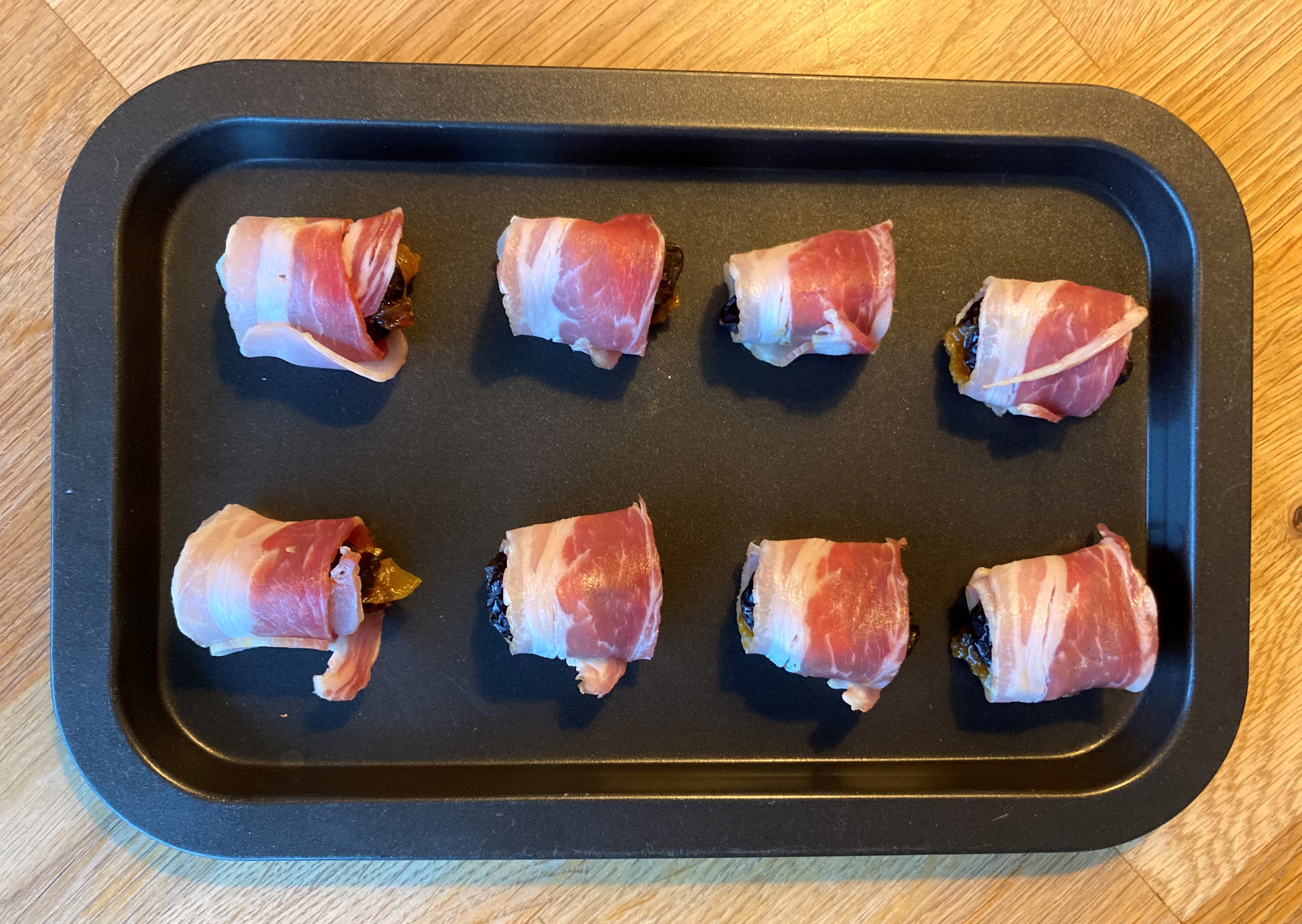 Verwarm de oven voor op 220°C. Week de pruimen even in wat port of iets anders lekkers als je ze te droog vindt (ik vind dat bij de Pruneaux niet nodig). Snijd open, haal de pit eruit en vul de holte met de chutney. Wikkel de pruim in het spek en bak 10 minuten in de hete oven.