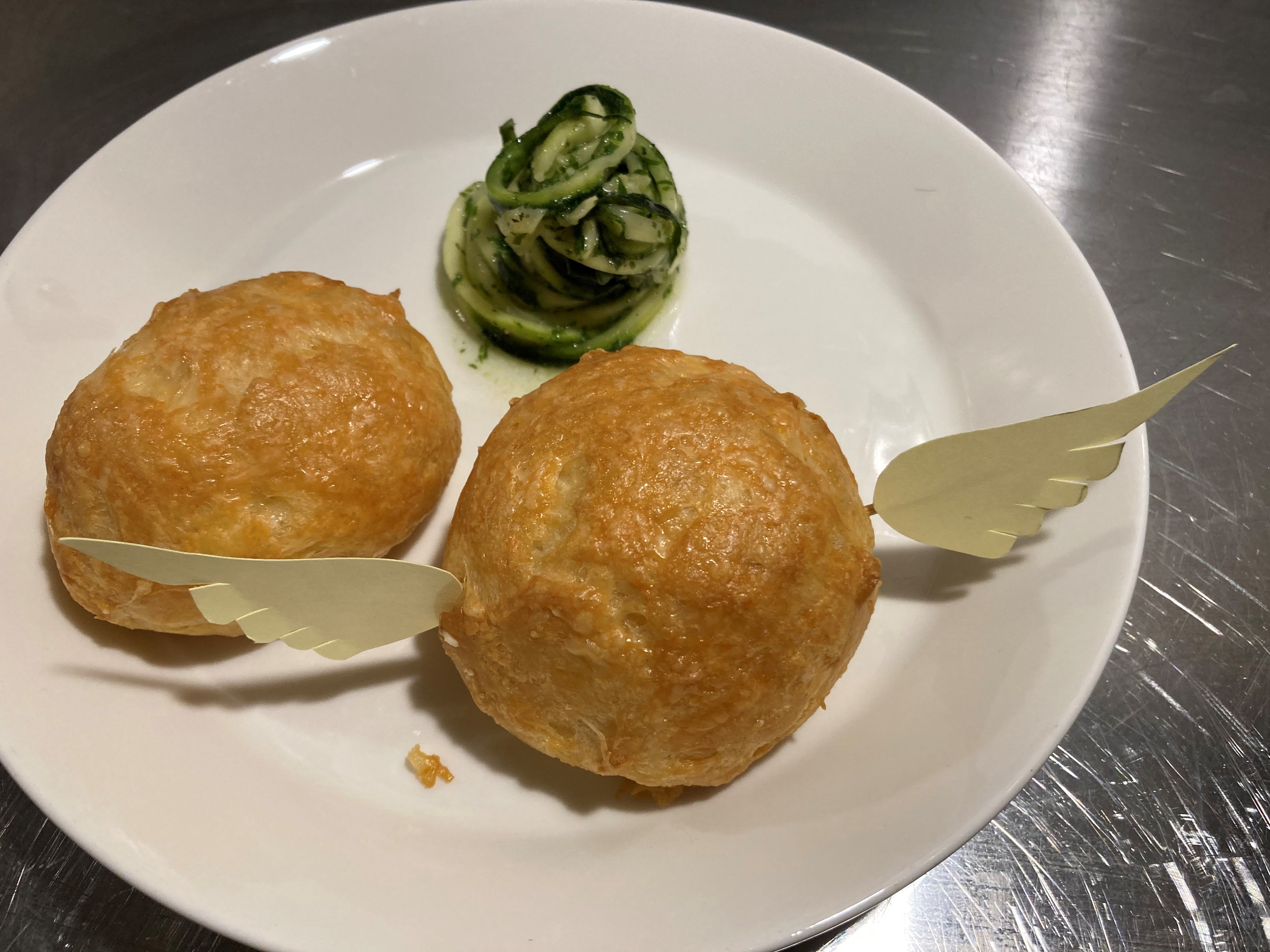 Maar ik had zoveel plezier! Grissini als toverstokken, geroosterde noten als ‘dragon roasted nuts’, devils on horseback als ‘cockroach clusters’ om mee te beginnen en vervolgens een gougère vermomd als ‘snitch’ met ‘gillyweed salad’ van courgette. Dat was nog maar het begin!