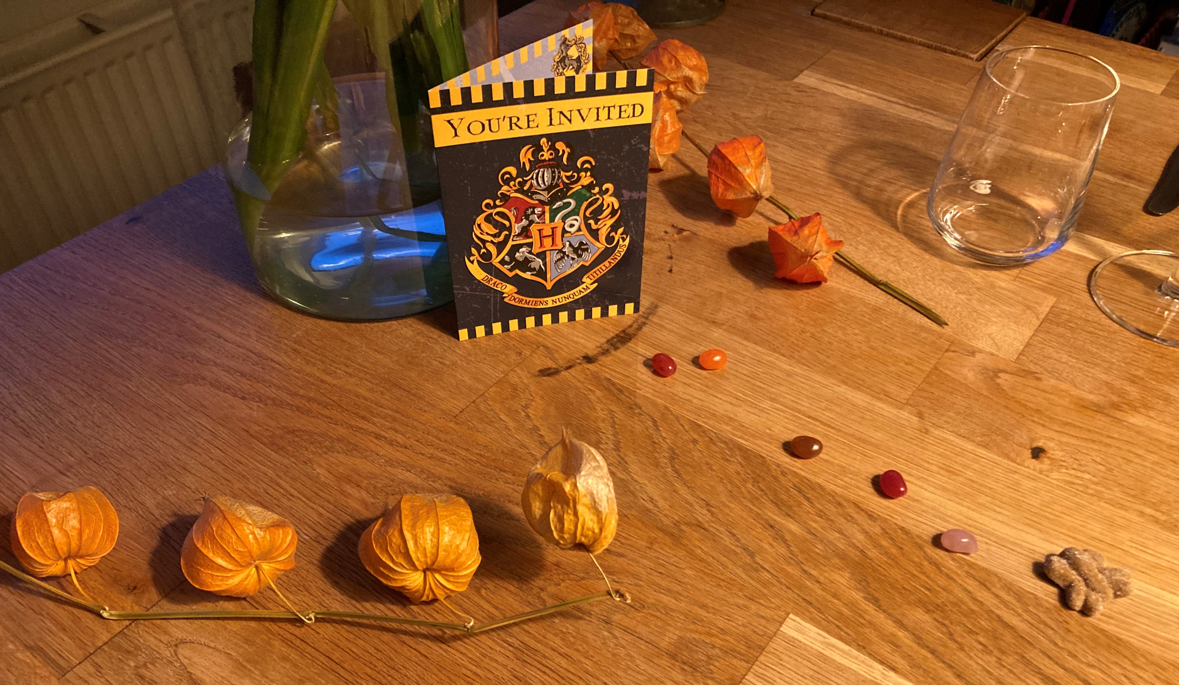 Er werd uitermate enthousiast gereageerd op mijn uitnodiging en op de dag zelf kwam eetclubmaatje S. verkleed als Hermione binnen, met in haar hand een zakje echte ‘Bertie Bott’s every flavour beans’ voor kleine L. Iedereen bleek ongeveer net zo gek te zijn op die boeken als ik! Ongelooflijk.