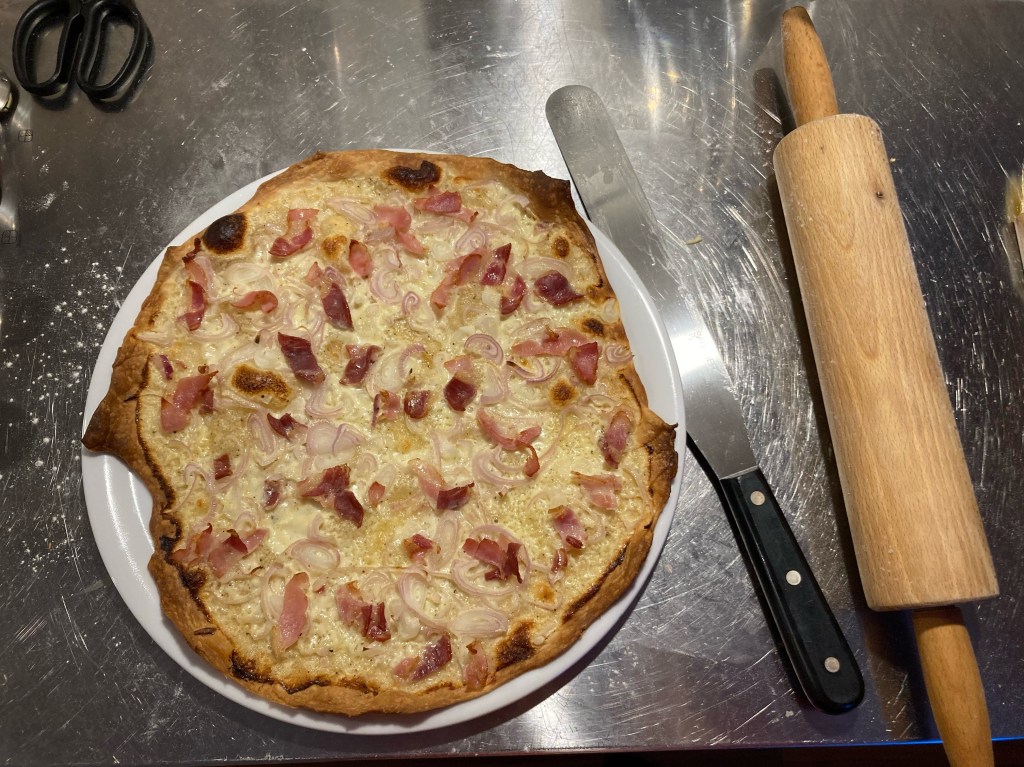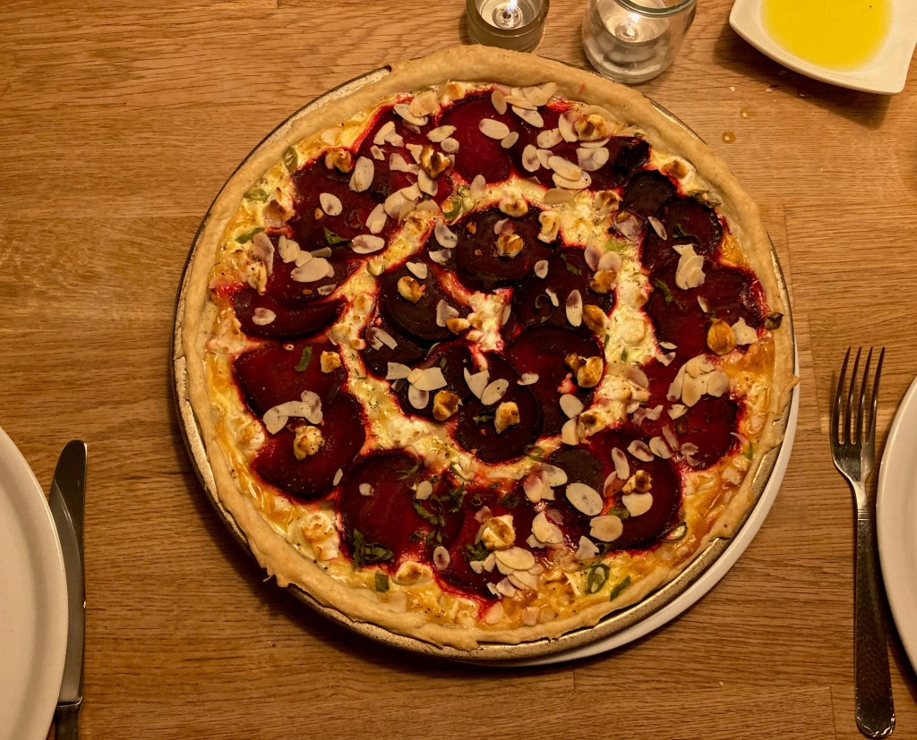 Als licht maal lekker met een salade van bijvoorbeeld veldsla, maar ook goed als voorgerecht of hapje in kleine vierkantjes. Je kunt de biet vervangen door andere groente, bijvoorbeeld linten rauwe courgette of paprika. Of stukken geroosterde venkel of pompoen. Of maak hem eens met paddenstoelen, rozemarijn en Emmenthaler. In plaats van amandelen kun je ook pistachenoten of pijnboompitten gebruiken. Het deeg dat ik over had gebruikte ik de dag erna voor een snelle flammkuchen met het restje spek van de devils. Nou ja, allemaal lekker.