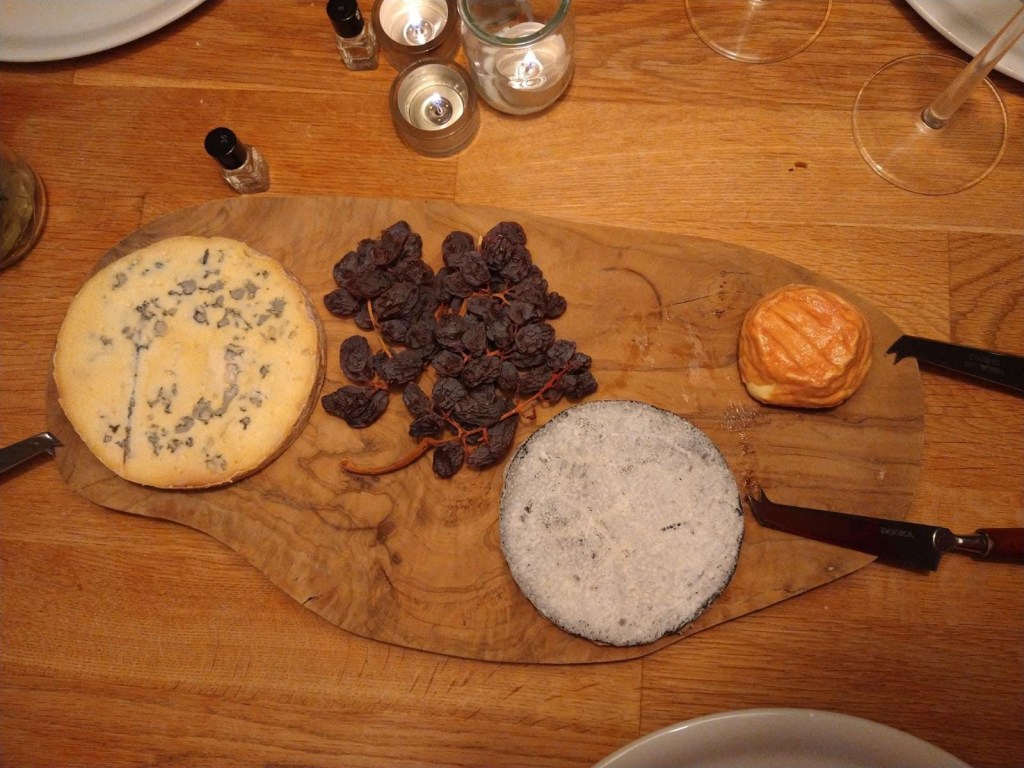 De Onsnorrige had onderweg bij een kaaswinkel spontaan bedacht dat een goede kaasplank wel lekker zou zijn en ze had gevraagd om ronde kazen. De uitbater had wat verbaasd gevraagd wat voor soort kazen ze dan wilde en was nog verbaasder door het antwoord: ‘Maakt niet uit, als ze maar rond zijn.’ Dat waren ze: een mini-Epoisse, een plak Fourme d’Ambert een rond geitje met as. Ze waren heerlijk en de Wijnzuster haalde meteen één van haar dessertwijnen tevoorschijn (ze had er twee): een Muscat de Beaumes de Venise. Hij paste vooral prachtig bij de blauwe kaas, zo’n aromatische vin doux naturel met honing, muskaat en tropisch fruit. Deze gang was echt een cadeautje.