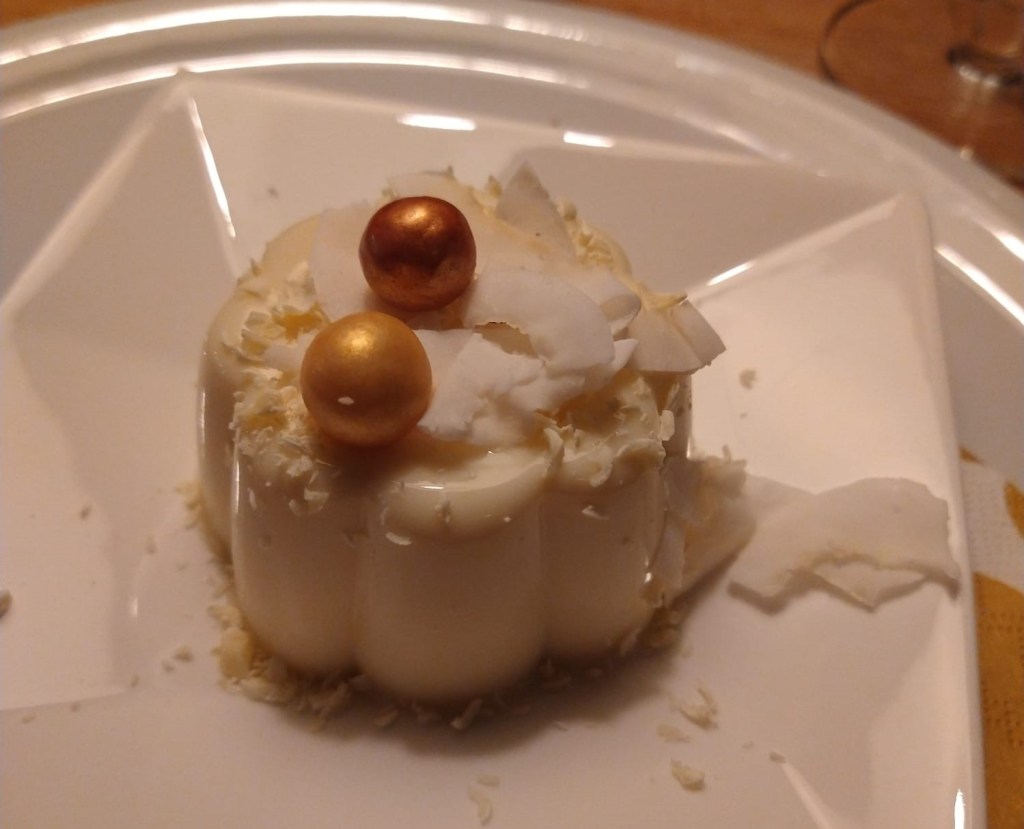 De laatste gang was dat echter zeker ook: een proefdessert voor het kerstdiner van de Wijnzuster, waarvan het gedurende de avond steeds onwaarschijnlijker werd dat het de kerstgasten ooit zou bereiken, gezien de nieuwe maatregelen. Maar wij genoten ervan: pannacotta met kokos en kardemom, geserveerd met gouden balletjes en geschaafde witte chocolade. Heel feestelijk, zeker met twee muskaatwijnen: de muscat de Beaumes de Venise en een Moscato d’Asti. De Onsnorrige had meteen door dat het dezelfde druiven waren en ik haalde de muskaat eruit. Wat een team! Vergelijkbare druiven, met vergelijkbare tonen, maar een heel andere vinificatie en daarmee zo’n ander mondgevoel en zo’n andere stijl. De Moscato d’Asti, hoewel het minst rond, paste het best.
