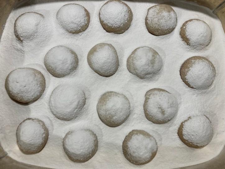 * Bak zoveel koekjes als je nodig hebt, bewaar het resterende deeg (tot enkele dagen) in de koelkast en bak een tweede lading koekjes als de eerste op is. De poedersuiker kun je dan zeven en hergebruiken.