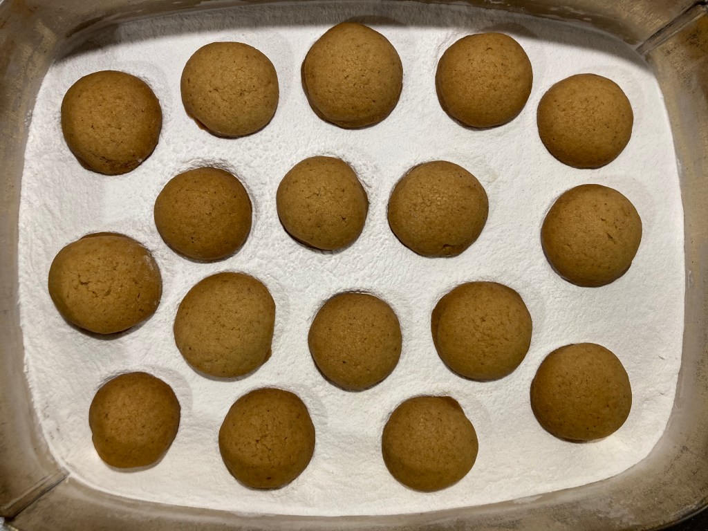 Laat de koekjes 10 minuten afkoelen. Bestrooi de bodem van een breed blik of platte doos royaal met poedersuiker. Leg de koekjes erop en bestrooi met nog meer poedersuiker tot ze helemaal bedekt zijn. Als je de koekjes al na enkele minuten in de poedersuiker legt, zal er een soort glazuurlaagje omheen ontstaan. Dat is ook mooi. Vanille in plaats van kardemom is ook lekker. Eet met liefde!