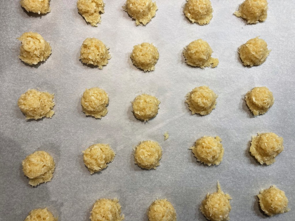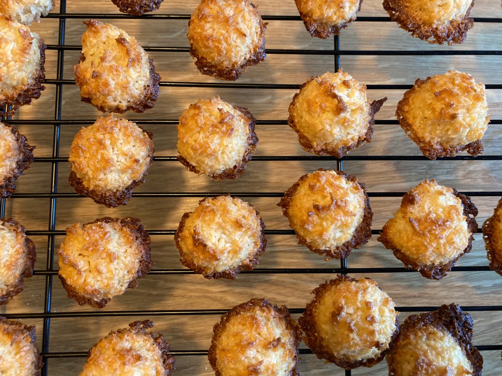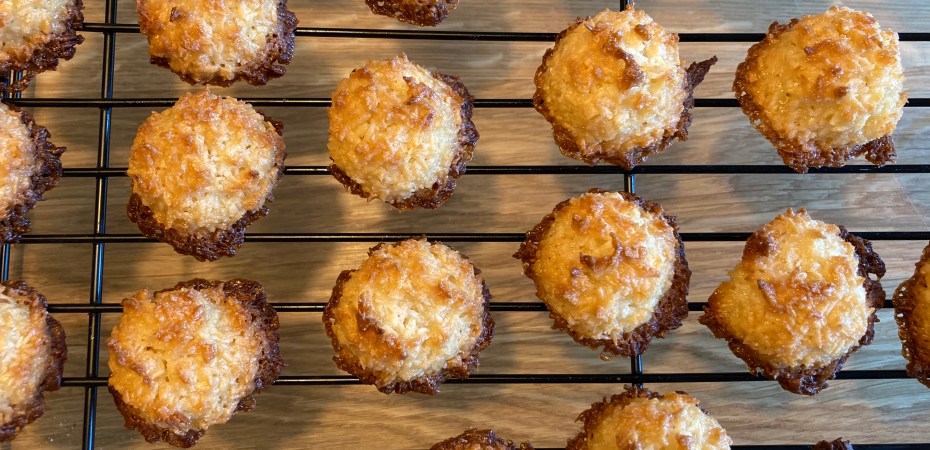Ik kocht een oventhermometer en maakte kokoskoeken. Dat is eigenlijk de oplossing voor zo ongeveer alles: als traktatie, bij liefdesverdriet, voor je glutenvrije of vegan vriendin, bij onstilbare zoetbehoefte, als je snel iets op tafel wil zetten, in mini-versie als friandise bij de koffie – en dus ook om je oven te testen. Die dingen worden namelijk ineens razendsnel bruin, dus je moet ze goed timen en ik heb ze bovendien zo vaak gemaakt, dat ik de twee ovens goed kon vergelijken. Iedereen die langs kwam kreeg een kokoskoek én een zakje mee naar huis, ik nam ze mee naar pianoles en naar de verjaardag van mijn neefje, deelde ze uit aan de vriendinnetjes van kleine L. en gaf er een paar aan Mrs. Elegance die zelfs na een paar dagen nog zei: ‘we devoured them’. En aan het einde van de week snapte ik mijn oven en had ik vele verzoeken voor het recept. Voilà!