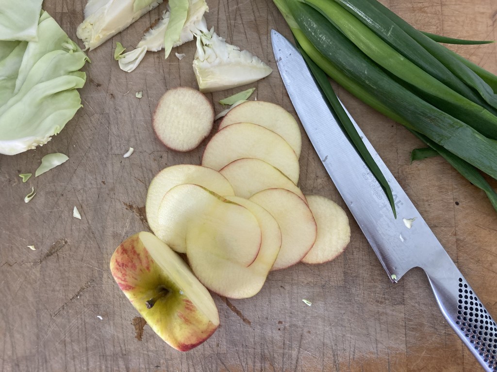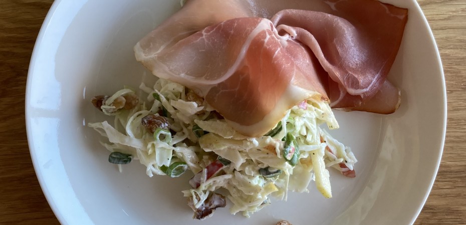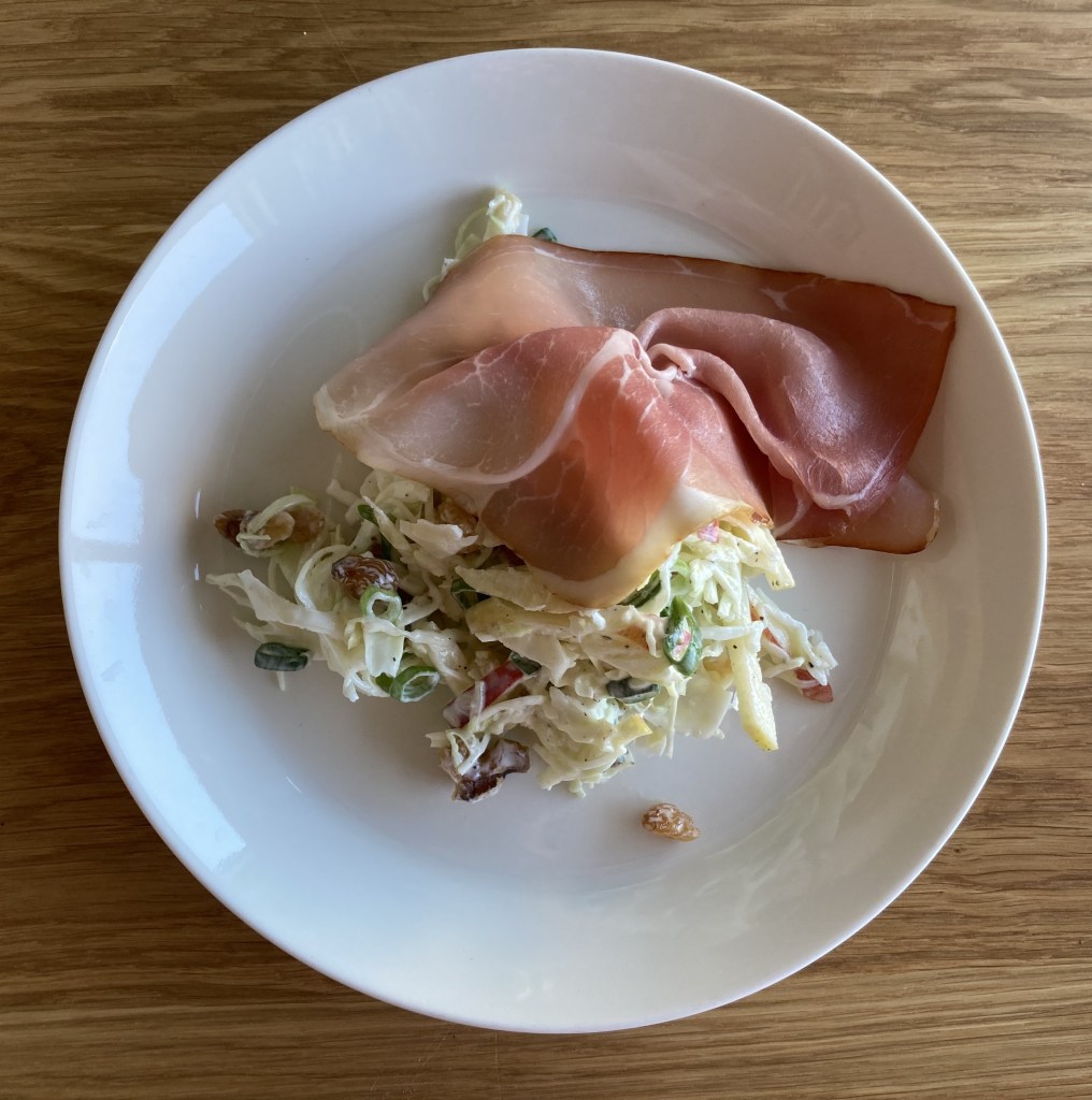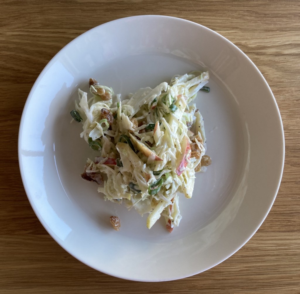 Die stiekem vrij snorrige echtgenoot had me geïnspireerd! Ik had nog een halve kool in de groentela liggen – over van de minestrone die ik thuis al gemaakt had – en daarmee maakte ik mijn eigen oude vertrouwde coleslaw. Niks fancy: snel, eenvoudig en lekker als lunch, op brood met wat kaas of als licht diner met rauwe ham en goed brood met boter.