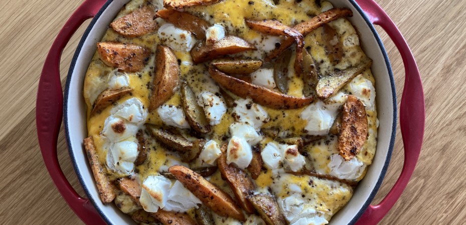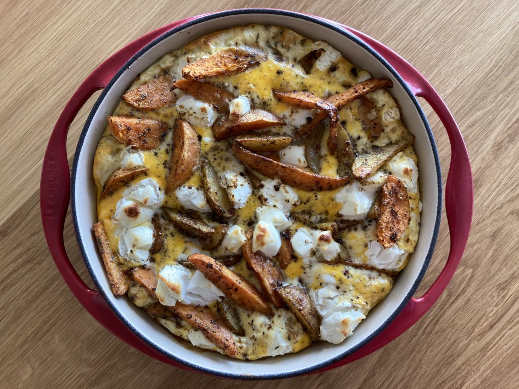 Deze frittata maak ik vaak van een combinatie van wortelgroenten met iets uiigs en knoflookigs. Het is gemakkelijk voor te bereiden: de groente rooster ik vaak de dag van tevoren al, dan hoef je de dag erna alleen je eimengsel er nog maar overheen te gieten. Gebruik groente die je lekker vindt: bataat, aardappel, wortel, pastinaak, biet, koolrabi, pompoen, rode ui, hele tenen knoflook… Restjes groente kun je dus ook mooi opmaken op deze manier. Ik vind feta of geitenkaas er lekker in, maar gewoon geraspte Goudse door het eimengsel is ook lekker. Ik gebruik als smaakmakers graag gerookt paprikapoeder, chilivlokken, oregano en tijm en in de winter vind ik komijn lekker, maar een kant-en-klaar mengsel van het één of ander is ook goed . Kortom, zie dit maar als een idee waar je vooral je eigen versie van kan maken. Met een groene sla en goed brood is het een lekker maaltje en het is ook fijn om mee te nemen als lunch.
