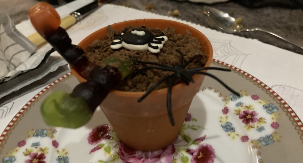 Terwijl echtgenoot J en kleine L overal spinnenwebben vol zwarte spinnen ophingen en de tafel dekten, bereidden wij het diner dat mrs Elegance bedacht had: guacamole kots (die door een pompoen uitgebraakt zou gaan worden), heksenvingers (hartig dit keer, korstdeeg met parmezaan), spokenpizza’s, shepherd’s pie met spoken en grafstenen en een potje aarde met wormen (chocolademousse met verkruimelde chocoladekoekjes). Naast de spinnenwebben waren er overal ballonnen, lolly’s is de vorm van skeletten en spoken, enorme chocolade oogballen, servetten met spinnen en uitgehakte pompoenen. Het werd een heerlijke avond. Kleine L kwam in Harry Potter kostuum aanzetten, ze schminkte bij echtgenoot J spinnenwebben op zijn gezicht en mr Elegance kreeg een staartje. Het eten zag er geweldig uit en was nog lekker ook. Tegen het einde kwam er een mooie Canadese rode icewine op tafel, werd er hier en daar aan een spook geknabbeld of een oogbal verorberd en onze gapende Harry moest echt naar bed.