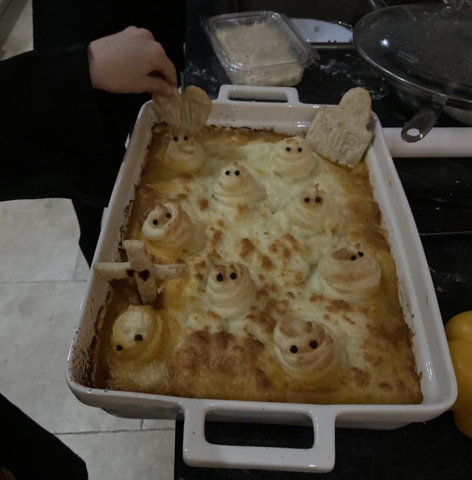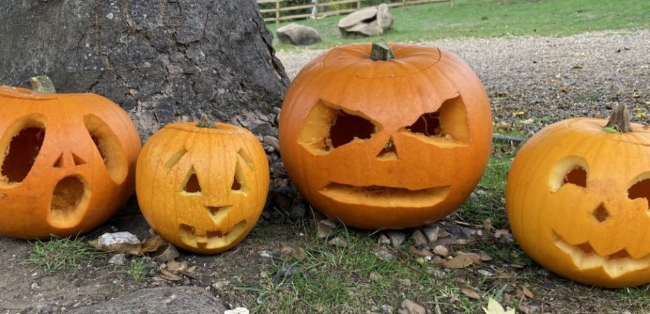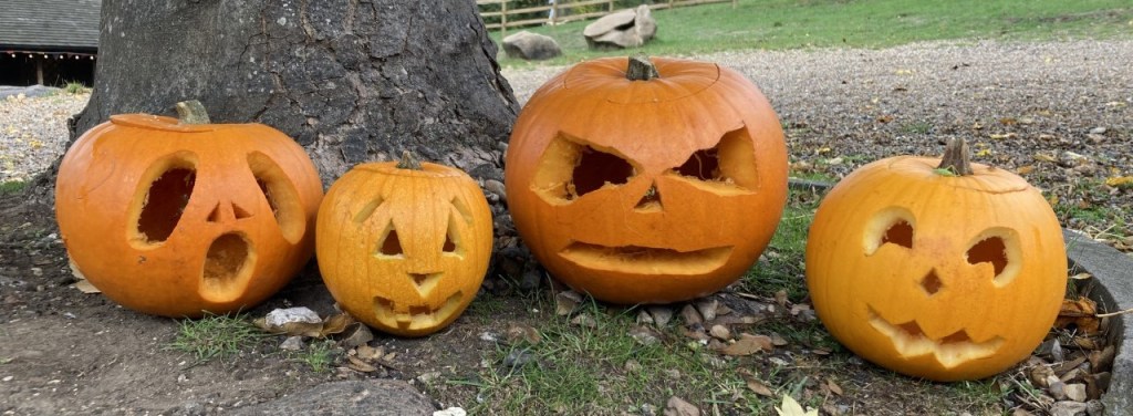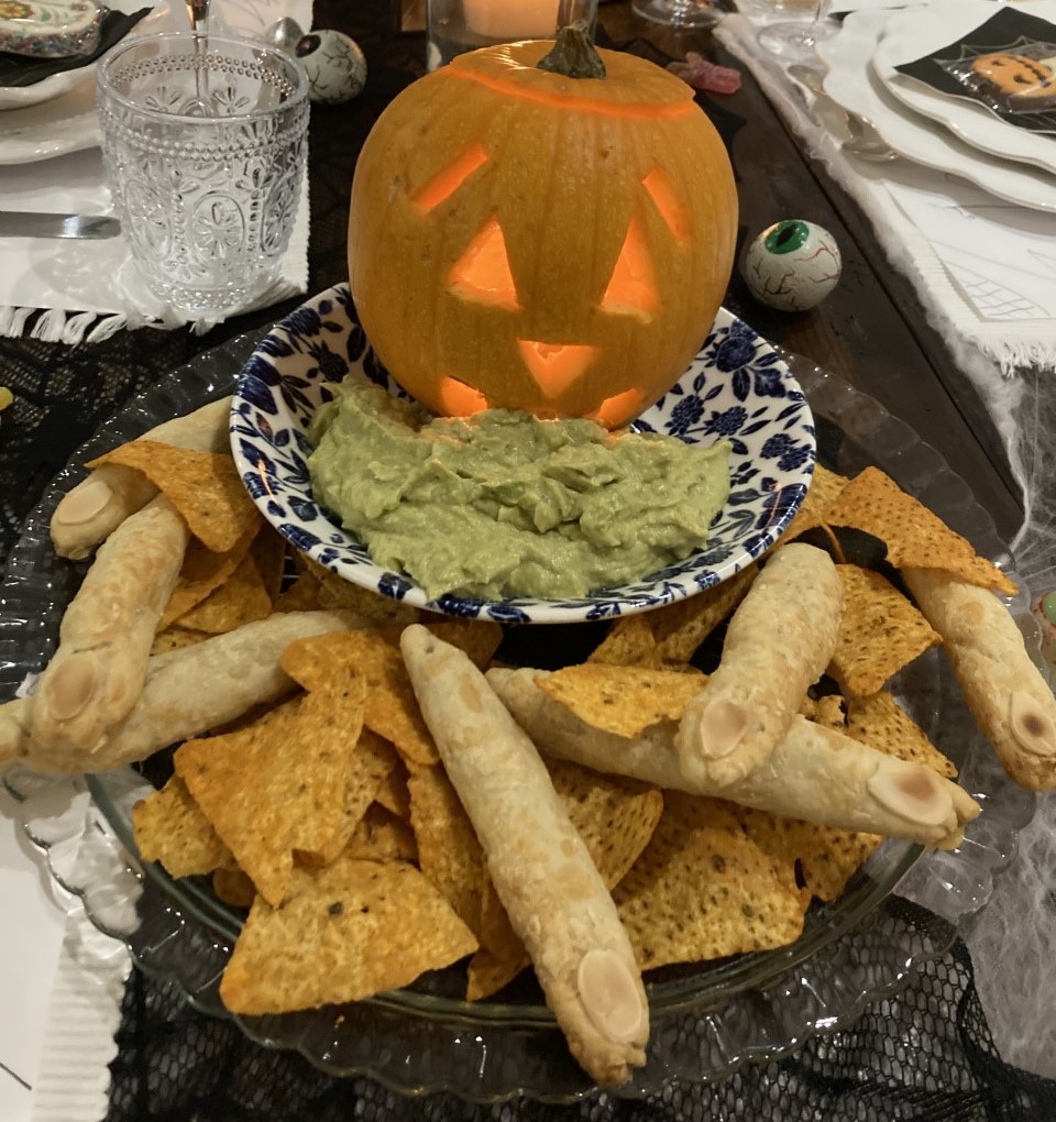 Daar moest ik aan denken toen ik in de herfstvakantie, precies 10 jaar later, met kleine L en mrs Elegance stond te pumpkin carven op een prachtig Engels landgoed. We hadden op een veldje met een vogelverschrikker de mooiste exemplaren uitgezocht en hakten er vrolijk de engste gezichten uit. We liepen de ghost trail door de schuilkelder, tuin en boomgaard langs skeletten en graven (here lies Dusty Bones, beloved wife of S.K. Eleton), aten de beste tosti ooit in de schuur van de lokale boer (die zijn eigen, bijzonder lekkere kazen maakte) en gingen toen gauw naar huis om het diner voor te bereiden. Een Halloween diner!