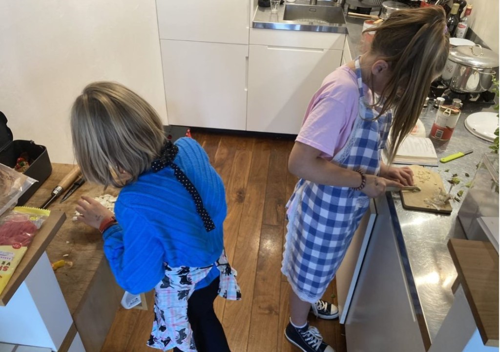 Maar… ineens was daar ook de kleine eetclub! Dat werd dan wel weer kermis! De BFF van kleine L (die kleine van de Wijnzuster, kind aan huis) had gezien hoe mooi de tafel gedekt was toen ik eetclub had, ze had de verse kruiden uit de tuin en de gepersonaliseerde luciferdoosjes zien liggen op de servetten en ze had mij uren rond zien lopen in mijn schort. Ze vond het prachtig. Dus ze had van mij als verjaardagscadeau een middagje samen koken en een avondje dineren cadeau gekregen. En daar kwam ze hoor, op een zaterdagochtend toen wij net aan het ontbijt zaten: ‘Hallo ja ik kom even een plannetje maken voor ons diner dus hier ben ik en ik heb trouwens ook nog niet ontbeten en mag ik een boterham met pindakaas?’ Ze nestelde zich naast kleine L op de eettafelbank, kreeg een boterham met pindakaas en toen begon de vergadering. Ze wilde drie koks (kleine L, zij en ik) en vier gasten. Haar moeder mocht toch ook komen (als ze lief was). De meiden kwamen al snel tot een mooi, kleurrijk menu en een goed kookplan en gingen na de boterham met pindakaas met z’n tweeën boodschappen doen. Trots kwamen ze terug met twee volle, zware tassen en die middag gingen we aan de slag. Schort voor en koken maar!