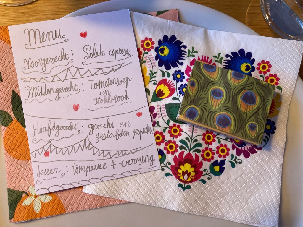 Ongelooflijk wat meiden van (bijna/net) 9 al zelfstandig kunnen! Vakkundig werden de uien gehakt, gesauteerd en verwerkt in een tomatensoepje (het middengerecht!), ze gingen zelf aan de slag met de tompouces (‘Ik schrijf het graag op z’n Frans’) en de salade caprese zag er feestelijk uit. Het hoofdgerecht lieten ze aan mij over, maar ze dekten zelf de tafel, schreven menukaarten, kozen servetten, beplakten luciferdoosjes, zetten bordjes klaar, staken kaarsen aan, schonken roze limonade in een wijnglas en trokken een gezellig gekleurd shirt aan.