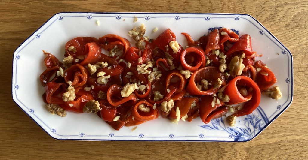 Nu ben je zover dat je de boel op kunt maken. Maak rozetjes van de paprika (of leg ze gewoon op een schaal), bestrooi met knoflook, walnoten en zoutflakes. Besprenkel tenslotte gul met goede walnotenolie. C’est ça (ik schrijf het ook graag op z’n Frans). Serveer met goed brood of walnotenkoekjes en een lekker glas. Bon appétit!
