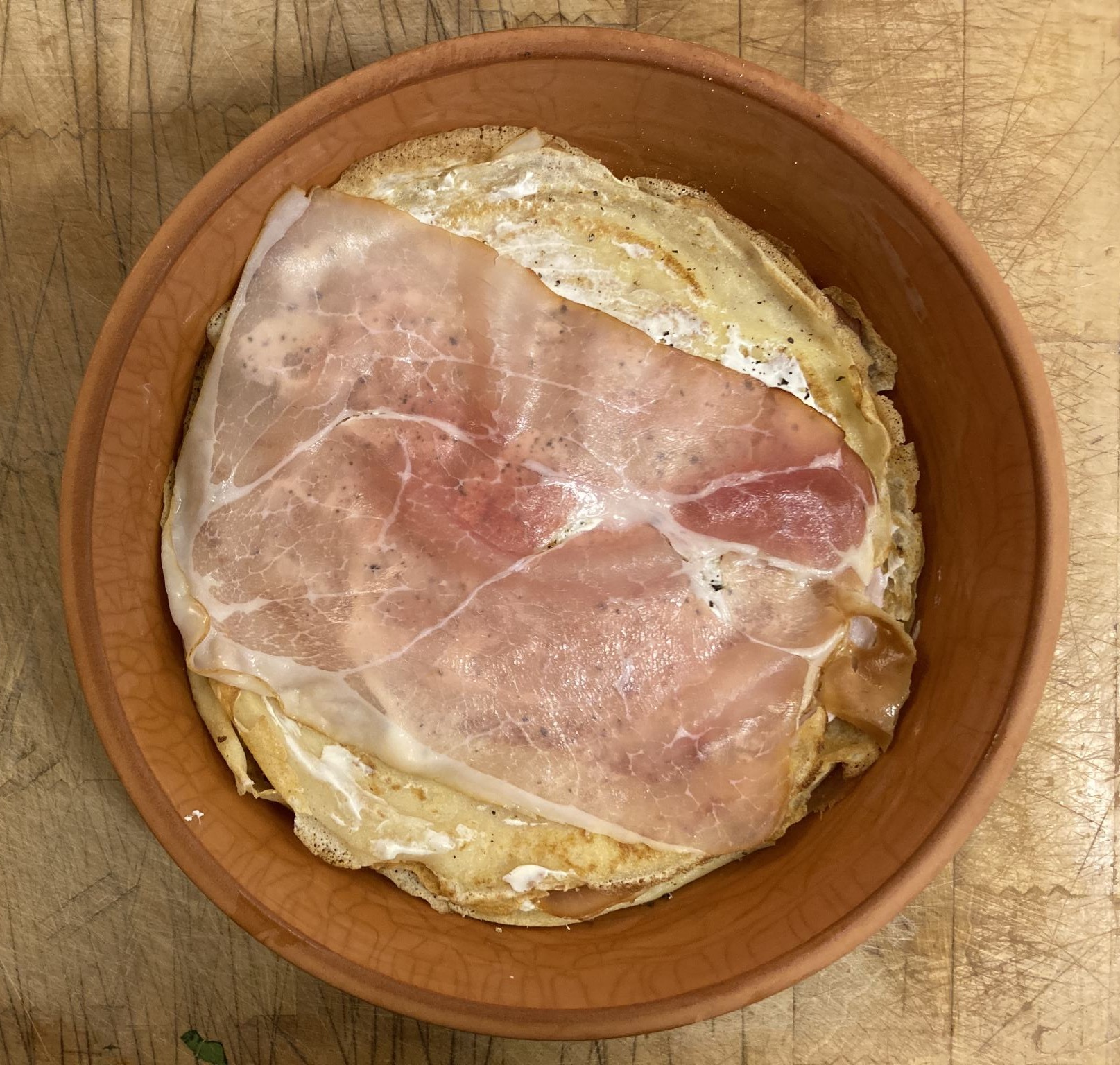 Pak een redelijk hoge schaal waar de flensjes in passen en stapel de taart als volgt. Besmeer een flensje met crème fraîche en bestrooi met peper en zout (niet te veel, de ham is ook al zout) en leg in de schaal. Leg er een plakje rauwe ham op. Beleg de volgende flens, kies dan de gekookte ham en leg op de andere flens in de schaal. Ga zo verder tot alle flensjes op zijn. Zorg dat je begint en eindigt met een flensje.