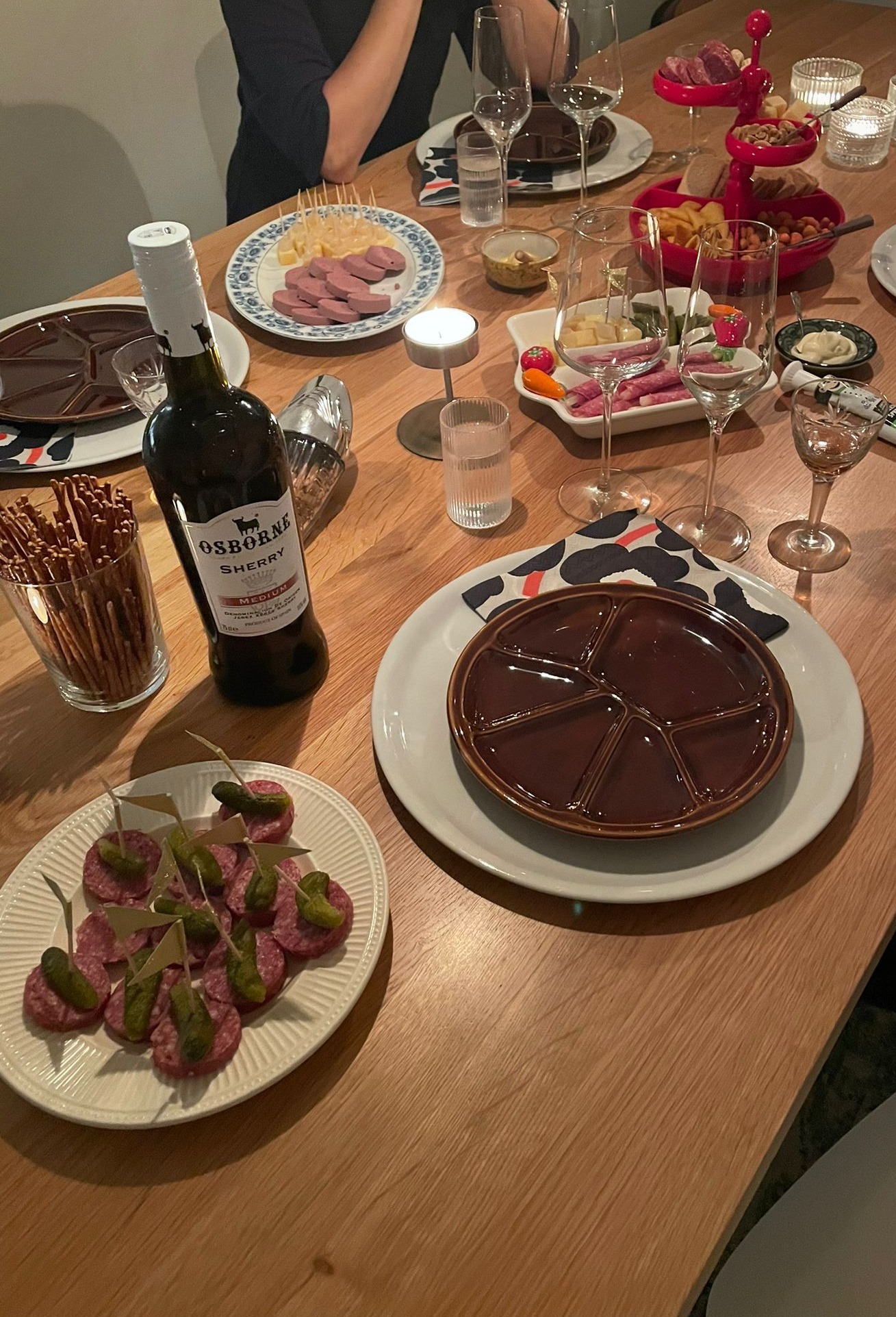 Ik kwam met vertraging aan met hoog haar, hoge broek, een rij felle armbanden en grote oorbellen. De tafel was al gedekt en stond vol met een kruising van jaren ’70 en ’80 servies en de vrouwen aan tafel waren zowel gekleed in stemmig-natuurpatroontjes-aardetinten als grote trui-hoge staart-felle oorbellen. Sja, je hebt de vroege en de late jaren ’80 zullen we maar zeggen. De tafel stond vol hapjes van de lijst van mijn moeder in een blitse rode hapjestoren en op bruine vakjesborden en de pinda’s zaten in een glazen vis waar je ze parmantig uit kon schudden. Stijlvol!