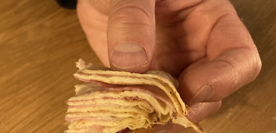 Pak een redelijk hoge schaal waar de flensjes in passen en stapel de taart als volgt. Besmeer een flensje met crème fraîche en bestrooi met peper en zout (niet te veel, de ham is ook al zout) en leg in de schaal. Leg er een plakje rauwe ham op. Beleg de volgende flens, kies dan de gekookte ham en leg op de andere flens in de schaal. Ga zo verder tot alle flensjes op zijn. Zorg dat je begint en eindigt met een flensje.