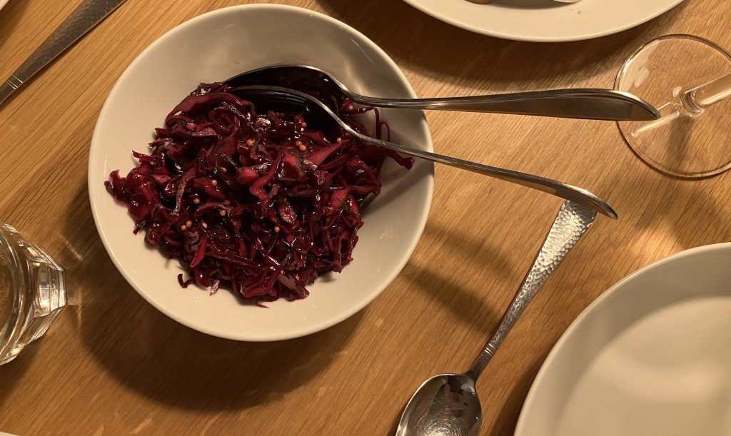 Oudhollandse bloemkool, zo schreef ik eerder, is niet mijn lievelings, maar Hollandse rode kool is dat zeker ook niet. Dat vind ik snel een beetje muf en zoetig en laf. Maar zoetzuur ingemaakt vind ik het heerlijk! Dus met Bali in mijn hoofd kneed ik al jaren rustig mijn kool met zoet en zuur en wat smaakmakers, net zolang tot hij langzaam zachter wordt, in balans komt en prachtig van kleur wordt. En na minimaal een nachtje in de koelkast eet ik hem het liefst met gerookte vis, maar ook op een platbroodje bij de lunch met humus of kaas of als onderdeel van een buffetje is het heerlijk. Wat niet opgaat, blijft wel een weekje goed in de koelkast. Daar wordt het zelfs alleen maar lekkerder van.
