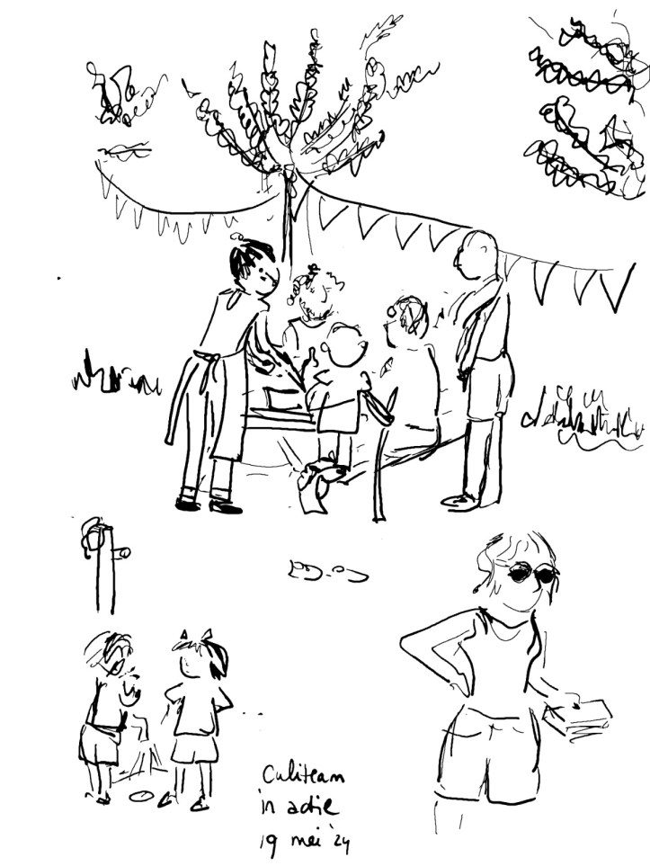 Een beukwilg was er niet dit jaar, maar angstaanjagend bleef het wel: echtgenoot J was dit jaar de spion. De Onsnorrige stond ergens in een douchehokje vermomd als Agent Fris te wachten tot de kinderen voorbij zouden komen, in het bos zat Agent Bos en bij het vuur zat… nou ja, Agent Vuur. En ik zat vermomd als een Engelse Agent Theelepel (tuttige bloemenjurk, bloemenhoed, theekopje met bloemen, theelepels in mijn haar en een hele lading mini-theelepeltjes) te wachten op die kinderen. In het theehuis natuurlijk. Héél lang, zat ik daar. Zó lang dat al die 144 theelepels keurig in een vierkantje op het tafelkleedje lagen, ik precies wist wat de mensen achter mij van die vervelende Randstedelingen en hun havermelk vonden en ik mijn ene regel tekst alweer bijna vergeten was. Maar ze kwamen hoor. En ze wilden allemaal zo’n schattige theelepel hebben.