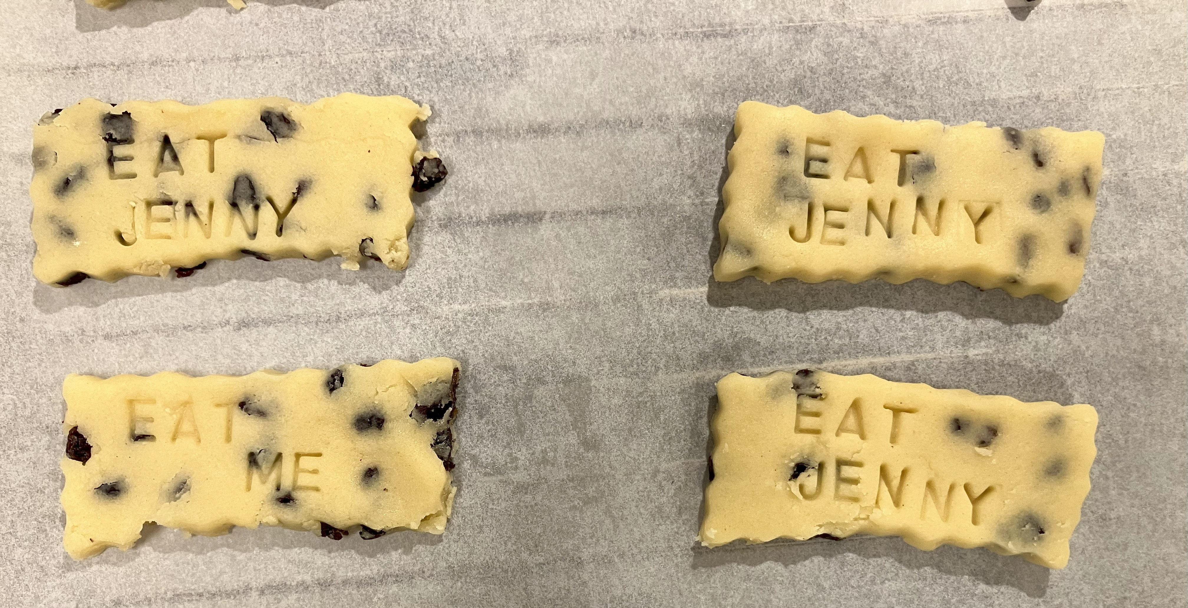 Die kleine van de overkant ging vol verve aan de hartige koekjes in de vorm van de symbolen op speelkaarten, kleine L aan de notenrotsjes en wij aan de rest (met een lekker glas, stond in de lijst!). De krentenkoekjes kregen van die twee niet alleen het stempel ‘eat me’, maar ook wonderlijke teksten als ‘eat girls’ en ‘eat Jenny’. Jenny is de poes. Zielig. Maar tussen het hoesten en snotteren door werd er wel hard gelachen.
