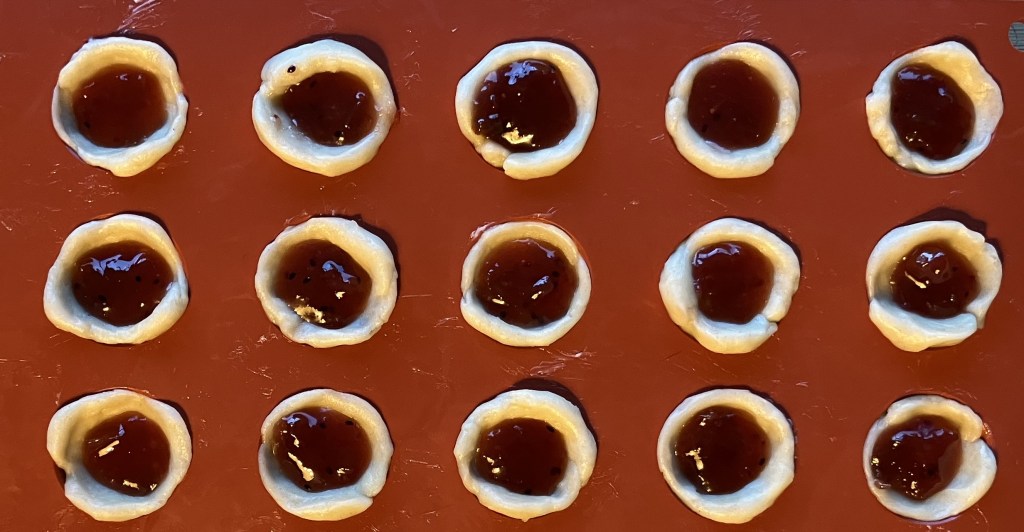 Vul met jam – niet te vol, dan stroomt het over. Bij een grote taart kun je nog een gezellig rastertje maken op de jam (of niet). Zet nog even in de koelkast terwijl de oven opwarmt naar 190˚C, dan krimpt het deeg minder. Bak tot de bodem gaar is en de jam borrelt. Bij mijn kleine taartjes was dat een kwartiertje, maar een grote taart duurt zeker een half uur. Zo vers mogelijk fijn met thee of koffie, als dessert of bij een bubbelig glaasje. Eet lekker!