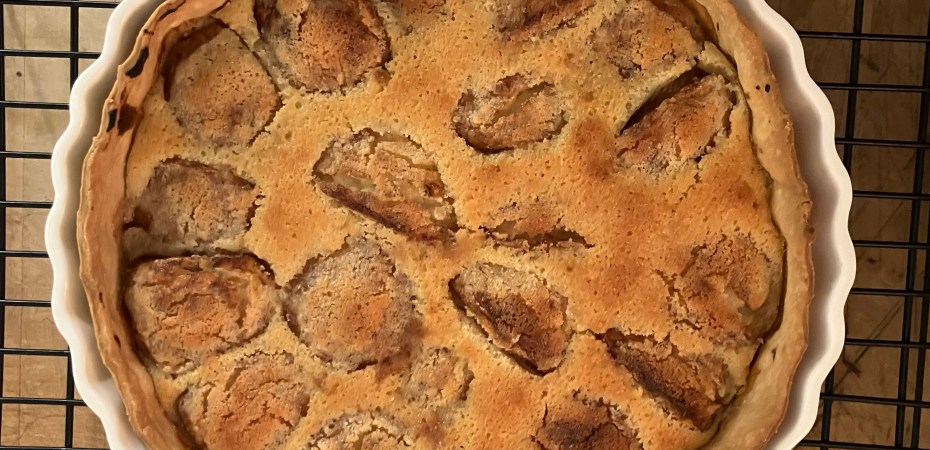 Meng boter, vanille, suiker, ei en drank naar keuze (Keda gebruikt Calvados, ik gebruikte Genepi – een bloemig Alpenlikeurtje) met de mixer tot het een glad geheel is. Strijk het uit over de appels en zet de taart nog een minuut of 20 in de oven tot de bovenkant goudbruin is. Laat even afkoelen en eet nog een beetje warm met een kop koffie of thee. Mmmm…